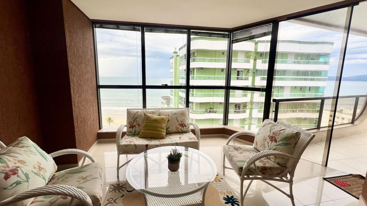 Excelente apartamento pé na areia da Praia de Itapema, perfeito para você, sua família e amigos curtirem ótimos dias de praia com muito conforto e tranquilidade. É só descer e desfrutar de areia limpa e mar calmo. Composto por 3 quartos, sendo 2 suítes (uma com jacuzzi), todos climatizados e com aquecimento a gás nos chuveiros. Sala integrada à cozinha com bancada americana, mesa para 6 lugares e churrasqueira a carvão no living room com vista deslumbrante para o mar.