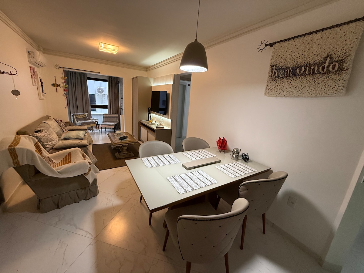 APARTAMENTO COM 3 DORMITÓRIOS (30M DO MAR/ORLA) - 1 Suíte; + 1 quarto cama casal; + 1 quarto Cama casal. - 2 colchões de solteiro. - 8 travesseiros. - 2 banheiros. - Sala integrada a Sacada e cozinha. - 4 condicionadores de AR, sendo um na sala de 12000btus. - 1 Vaga de Garagem, "Cabe uma Camioneta SW4" - Utensílios Domésticos. Talheres, Louças, panelas, microondas, forno Elétrico, maq. lavar Roupas. - wi-fi; Smart TV. OBS:O Apto NÃO fornece roupa de cama/banho e cadeiras d praia/guarda-sol.