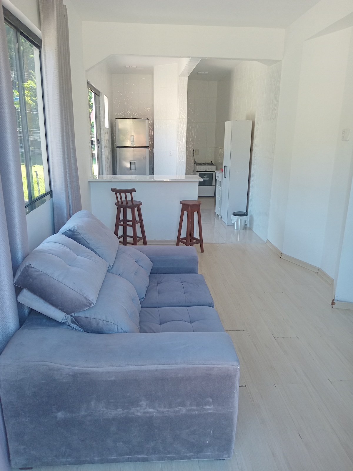 Relaxe com toda a família nesta acomodação tranquila. Kit para 04 pessoas , sendo 04 adulto ou criança .Dormitório cama casal, banho social , sala com tv a cabo e Wi-Fi , espaço com 2 cama solteiro , cozinha completa, espaço com tanque , área de lazer com mesa e cadeiras, entrada fechada com portões . Fornecemos roupa de cama e banho e também 2 cadeiras de praia e guarda-sol . Super bem localizado, mercado proximo, rua com segurança e super tranquila. Sem garagem. Sem pet. Diária + Tx limpez