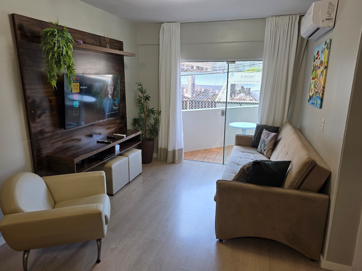 Apartamento novo, aconchegante, localizado no coração de Meia Praia, cerca de 100m do mar, próximo do Shopping, Burger King, panificadora, mercado, farmácia. Possui sacada com churrasqueira a carvão, sala de TV, sala de jantar, cozinha americana, banheiro social, 1 quarto e 1 suíte. Ambos os quartos possuem ares condicionados split. Imóvel dispõe ainda de um colchão de casal extra, que cabe no chão da suíte. O imóvel possui 1 vaga de garagem privativa, coberta, portão eletrônico e elevador
