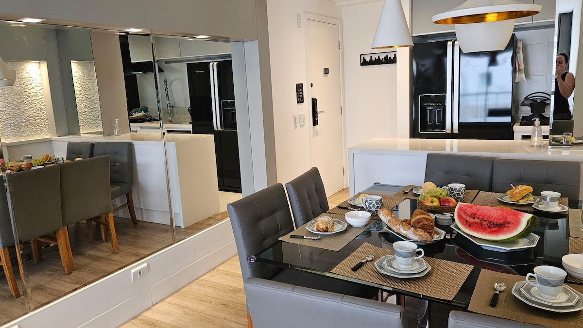 O Apartamento fica no 31º. Andar do Edifício 7th. Com uma vista "super" espetacular de tirar o fôlego, decoração alto padrão, com todos os utensílios, tem uma cama Queen além de ter o privilégio de curtir o nascer do sol através das montanhas. Conforto, limpeza impecável e roupas de cama e banho são itens de extrema dedicação, comprovados por todos os hóspedes. Para um melhor conforto e segurança a partir do mês 09 / 2024 - disponibilizamo de cortesia uma vaga de Garagem no próprio edifício 7th