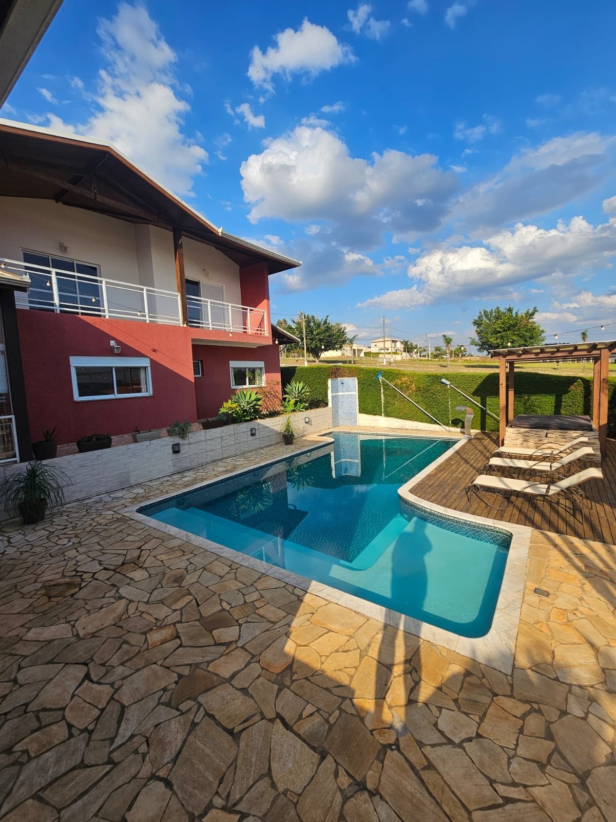 Chácara ensolarada em condomínio fechado com portaria fechada e acesso controlado. PISCINA COM AQUECIMENTO. Com 5 quartos sendo uma suíte mais 4 quartos, acomoda 4 famílias de 3 pessoas mais 1 casal com muito conforto. É sustentável, possui geração de energia solar. Possui amplo gourmet com churrasqueira, forno de pizza e fogão à lenha. Leve toda a família para se divertir. Cozinha completa com todos os utensílios e lava-louças. Smart TV 70 pol.