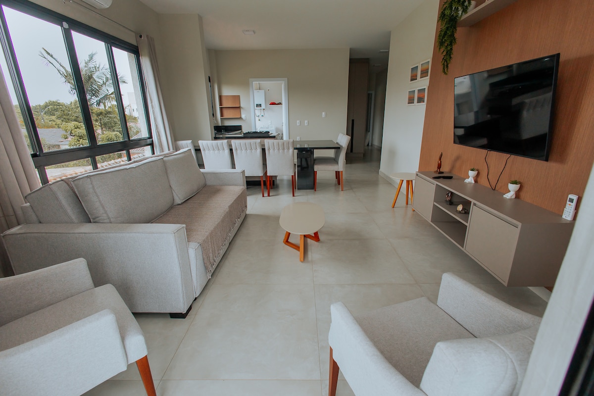 Sinta-se em casa e tenha momentos especiais neste apartamento lindo e charmoso, muito bem localizado, próximo à praia, restaurantes, mercado, farmácia, cafeteria, lavanderia e posto de combustível. Acolhe confortavelmente 6 pessoas, em uma suíte + um quarto e sofá cama. Possui ar condicionado nos quartos e sala, integrada a cozinha. Trata-se de um apto no térreo, com acesso independente e uma vaga de garagem exclusiva. Possui ainda lavanderia e um jardim privativo com uma linda churrasqueira.