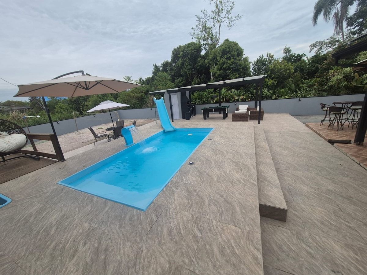 Temos piscina com tobogã,cascata e ombrelones,quadra de vôlei/fut vôlei, terreno com 390m exclusivo para nossos hóspedes, em uma rua sem saída a 450m da praia.Churrasqueira,cervejeira e mesa de sinuca,vários espaços únicos deck com vista para piscina, área interna e externa ambas com cadeiras e mesas, redes, balanços, estacionamento para até 4 carros, ar condicionado, wifi tv's 55 e 2 de 32 pol smart,3 quartos e 2 banheiros,tanque e varal disponíveis.