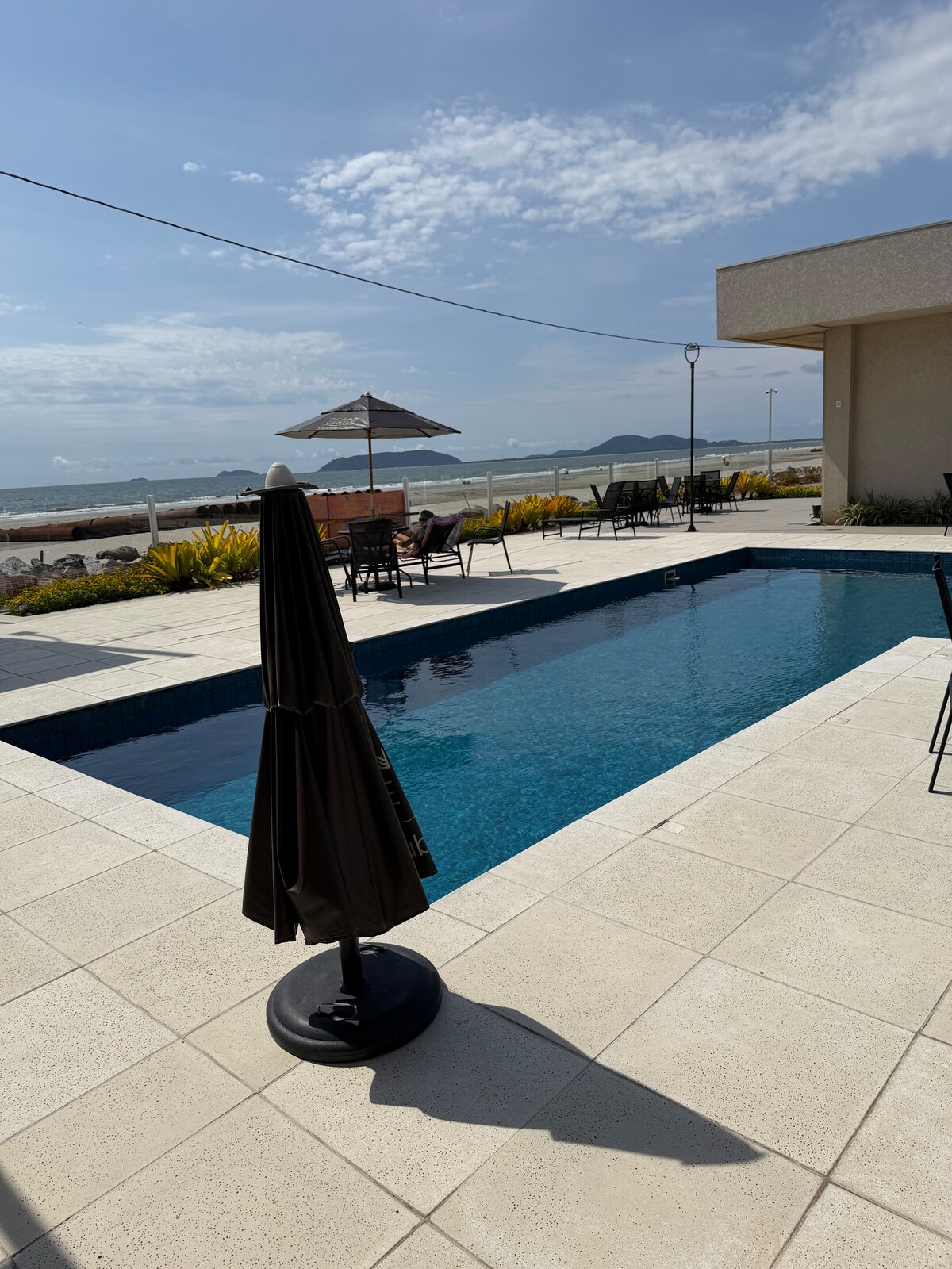 Apartamento em condomínio a beira-mar com acesso exclusivo a praia, possui: ar-condicionado em todo espaço cozinha completa 1 suíte e 2 quartos wi-fi + smart tv 65" churrasqueira privativa o condomínio fechado possui: terraço com churrasqueira piscina em frente ao mar parque infantil ao ar livre estacionamento (1 vaga) ideal para até 6 pessoas roupas de cama e toalhas de banho são fornecidas A apenas 1 km, há mercado, conveniência, farmácia, padaria e pizzaria.