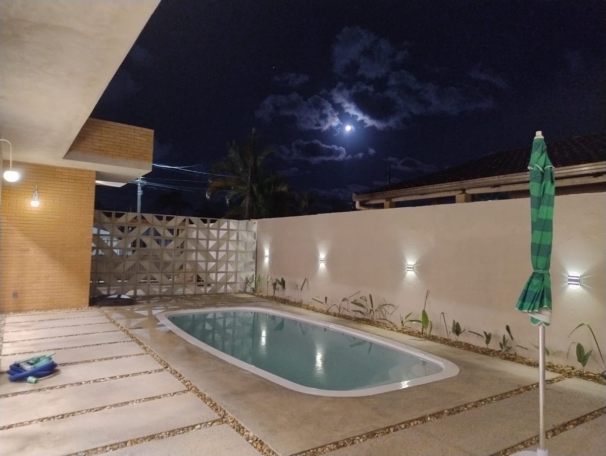 PISCINA AQUECIDA — UMA DAS ÚNICAS DA REGIÃO Com carinho em cada canto, esta casa homenageia minha vó. A piscina exclusiva tem aquecimento e tratamento com sal (mais suave pra pele e cabelo). Fica a 300m do mar, em área central e tranquila. São 3 quartos (2 com ar-condicionado), 2 banheiros, sala com TV smart e sofá confortável, cozinha equipada integrada à área gourmet, edícula com churrasqueira e mesa grande. Supermercado a 100m e moramos perto, sempre disponíveis pro que precisar.