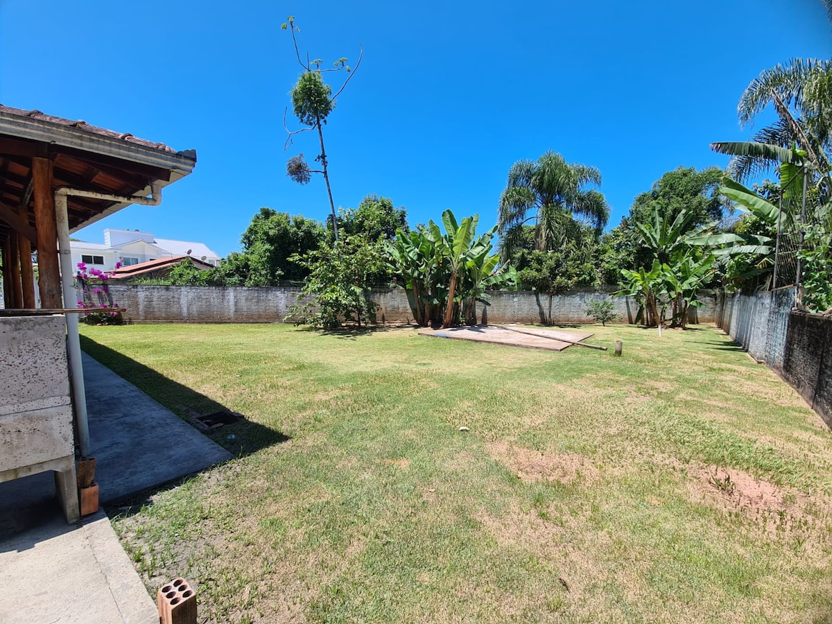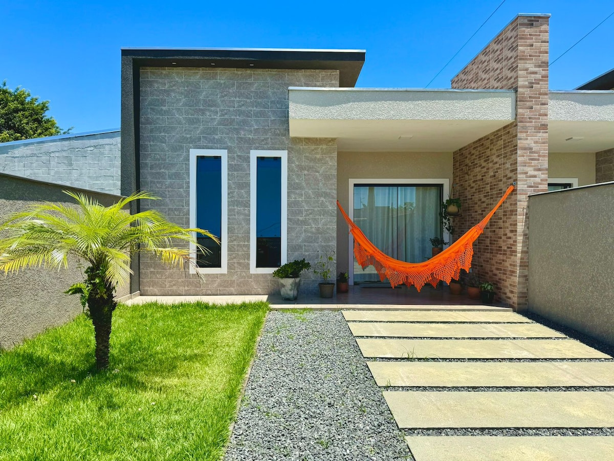Nossa casa é nova, terreno individual e amplo, muito aconchegante, arejada, 2 quartos, uma suite, AR CONDICIONADO nos quartos, conceito aberto, os ambientes são integrados, pergolado c churrasqueira. O terreno é grande 450m² ideal para crianças e seu pet brincar e se divertir. O ambiente proporciona integrar sua família e amigos, fica perto da praia, 5 quadras, menos de 10 minutos caminhando. Temos utensilio para churrasco ou refeições , roupas de cama. Você vai se sentir em casa.