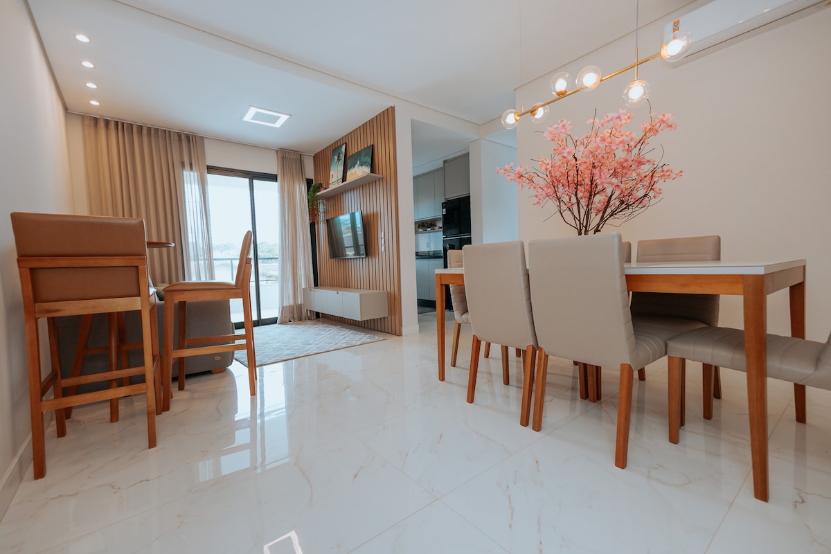 Apto recém terminado todo planejado e de excelente bom gosto. Acomoda tranquilamente 2 famílias, que buscam estar igual ou melhor acomodado que eu sua casa. Todos os ambientes climatizados, todos eletrodomésticos disponíveis e novos. Churrasqueira dentro da unidade. Condomínio conta com playground, fire place, churrasqueira externa, dentre outras facilidades e portaria remota 24h para segurança Dentro de 1 km vc tem farmácia, padaria, mercado, conveniência, restaurantes e outros comércios.