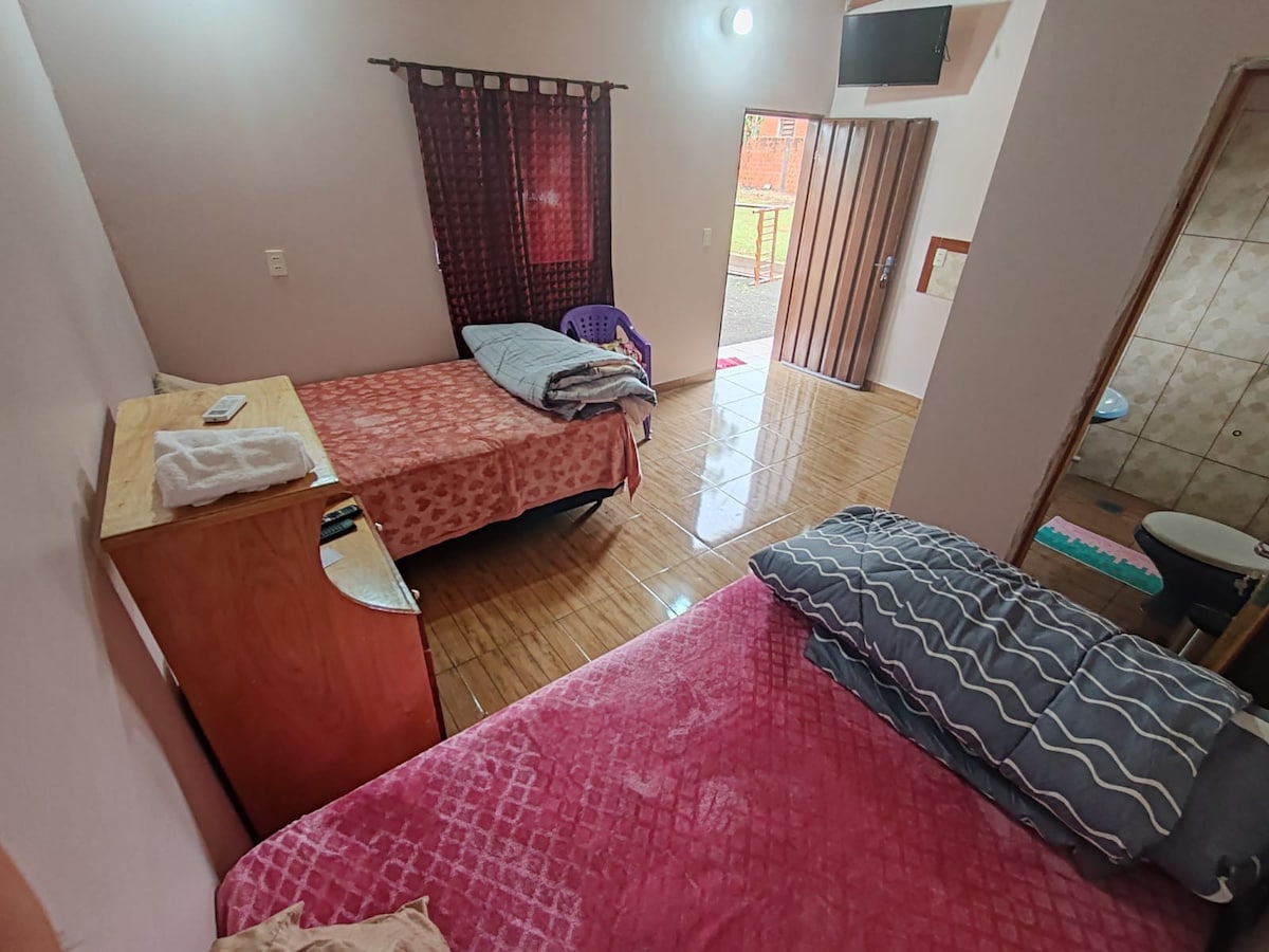 A minutos de la ciudad de Encarnacion, con todas las comodidades cerca, un lugar con estacionamiento propio, dos camas para 3 huespedes ( o mas ) un baño, cocina, sala/comedor y lavadero. Ubicado a dos cuadras de la Ruta 06, barrio muy tranquilo y seguro.