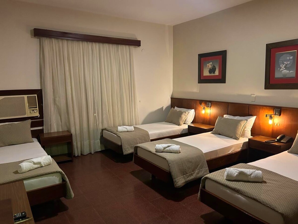 Habitación sencilla de hotel con baño privado, ducha eléctrica, wifi, estacionamiento privado. En zona céntrica, segura y tranquila. Cercano de restaurantes, supermercados y bancos.