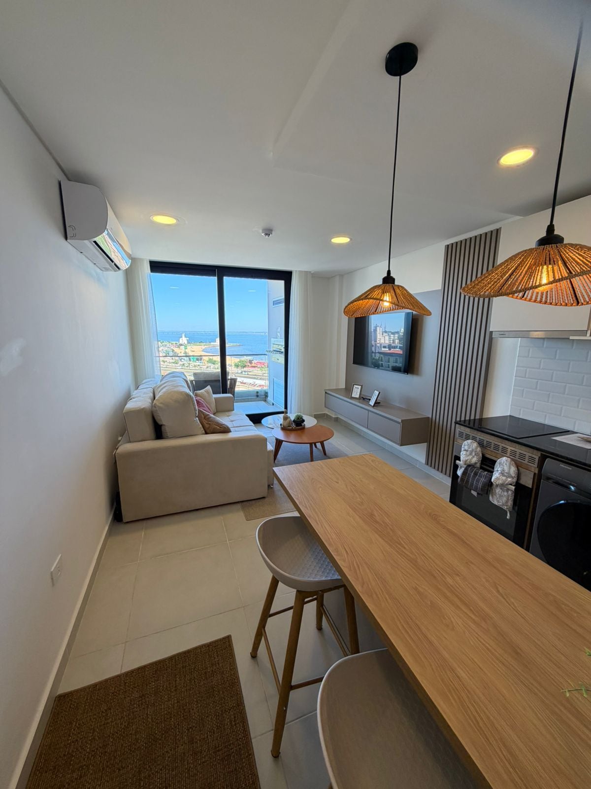 Este hermoso departamento amoblado zona Shopping Costanera Encarnación, balcon con vista al rio, cuenta con dos cómodas habitaciones, una en suite con baño privado ,cocina amoblada 🍽️ y comedor integrado , que crea un ambiente espacioso y moderno. También ofrece estacionamiento. Es una excelente oportunidad para quienes buscan comodidad. Servicios extras: -Wiffi -3 TV SMART - Utensilios básicos de cocina -Horno eléctrico -Cocina eléctrica -Microondas -Lavarropa -Hervidora -Mixtera