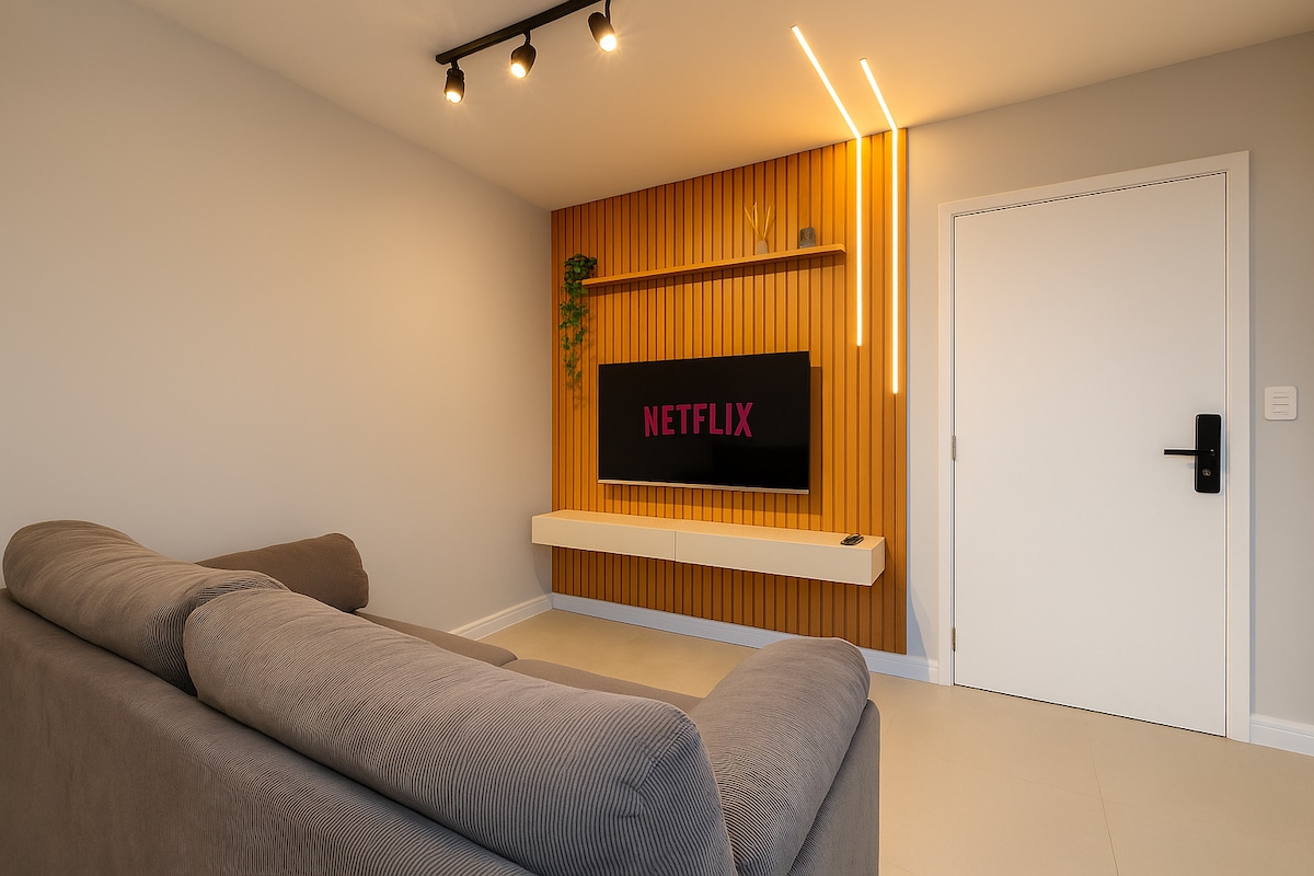 Apartamento novíssimo, no centro de Guarulhos, bem localizado, próximo a mercados, restaurantes, bares, shopping center; Ar-condicionado, máquina lava&seca, forno, fogão, geladeira, utensílios domésticos, home-office, fechadura eletrônica, estacionamento grátis, piscina, sauna, academia entre outros. O apartamento tem tudo o que você precisa para uma ótima estadia para períodos curtos ou longos. O local oferece cama de casal, sofá, televisão com Netflix e PrimeVideo.