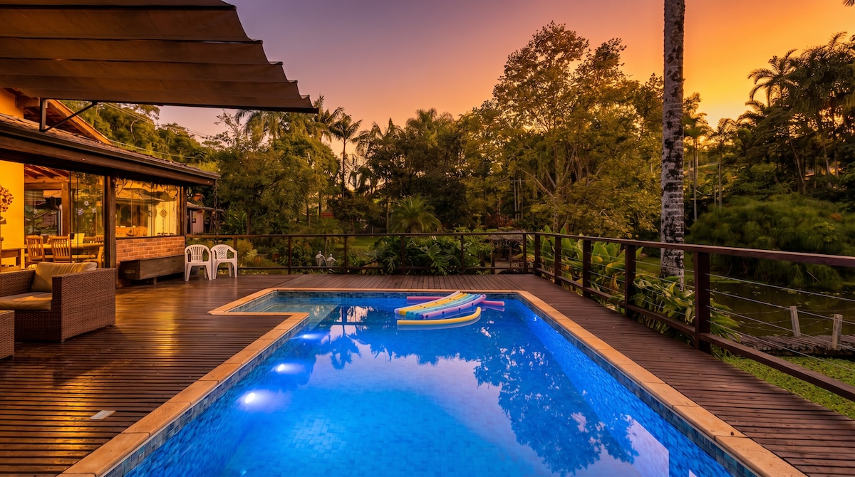 Mountain house in contemporary style, clean and comfortable, located 1 hour from the center of São Paulo. Good architecture, north face and double height foot, built in stone, wood and glass. Land of 42 thousand m2, in reserve of Atlantic forest, with stream of clean waters, shower and natural pools. Cozy setting of total tranquility and privacy. Perfect for weekends, due to proximity. And delicious for holidays and extended holidays.
