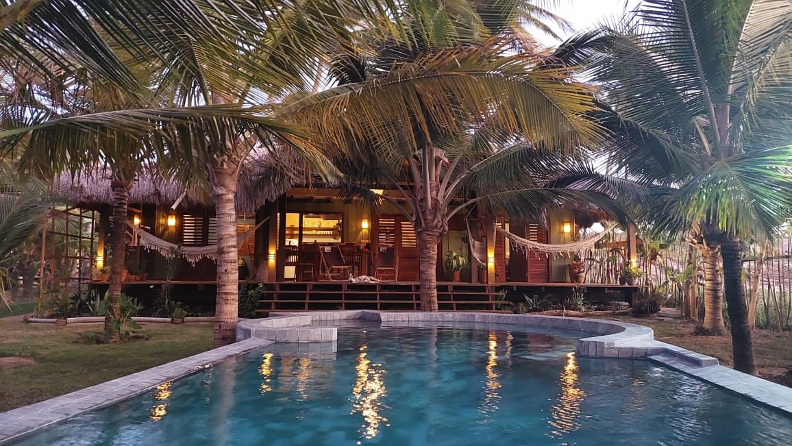 Vila de praia com piscina num terreno de 5000m2 na beira dum dos melhores spots de kitesurf do Brasil, Ilha do Guajiru, perto de Jericoacoara. A vila tem 3 suites com ar, cada um com esse banheiro proprio e WC separado. Um studio, tambem com ar e banheiro completa a casa. ela tem sala de jantar com cozinha americana, duas varandas e um grande deck. O accesso ao mar e direito, voce pode descolar e pousar os kites no grande gramado na beira da praia. A 100m, tem escolha de kitesurf e restaurante.