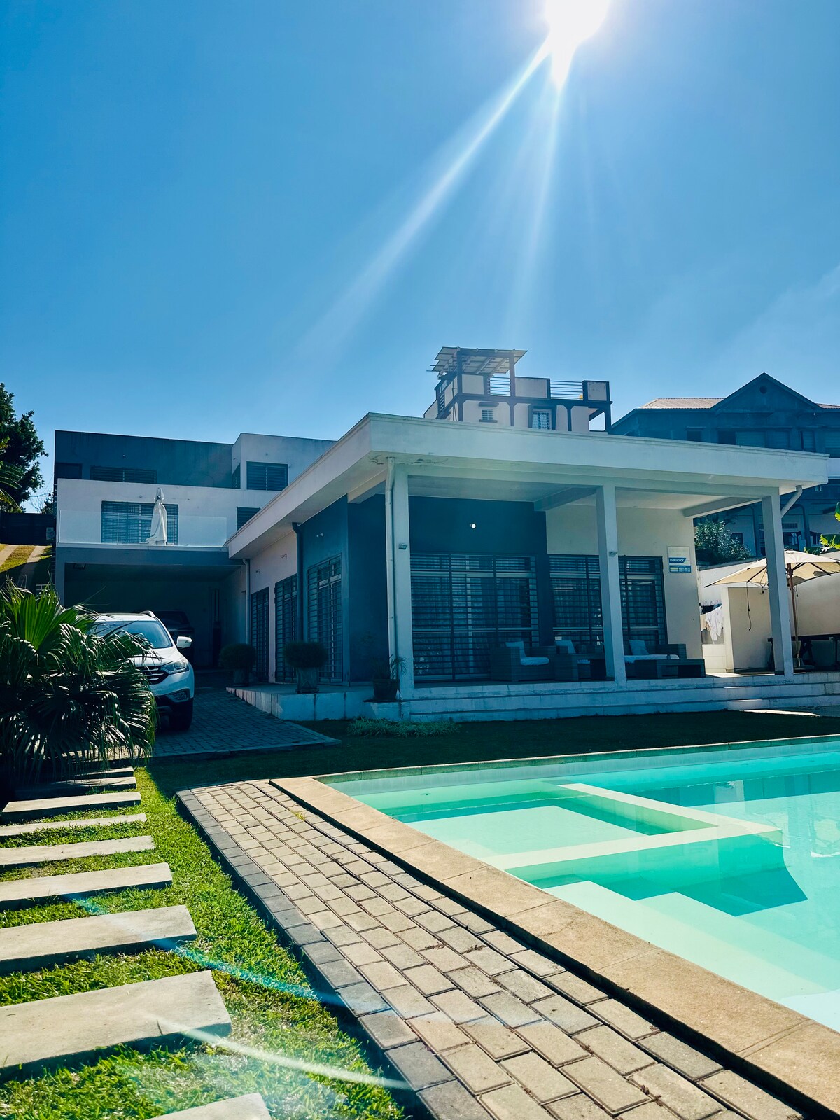 Relax with the whole family at this peaceful place to stay. This is a modern house with a fully fitted kitchen, dinner room, comfortable TV room with satellite channels. The two main bedrooms have double beds, and amazing views from the upstairs balcony! The 3rd room has two single beds suitable for the kids. The property has a dedicated person who handles security and access, and does some cleaning. This is the perfect place in the suburbs surrounded by real Malagasy people! Truly exceptional!