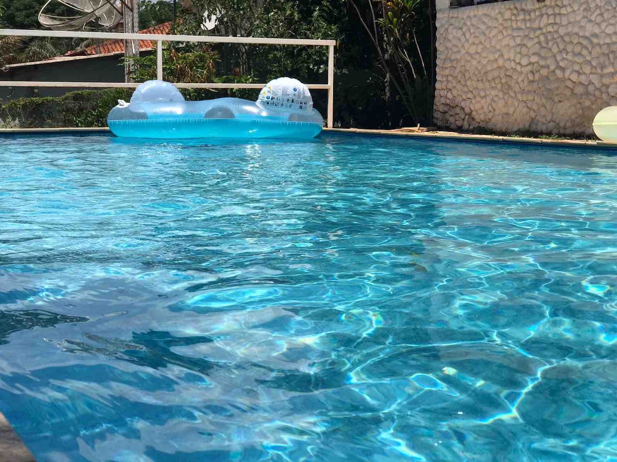 Casa tipo sobrado, estacionamento com espaço para 10 ou mais veículos, piscina infantil e adulto, campo gramado de futebol e vôlei. Área coberta com churrasqueira e forno para pizza. Acomoda até 20 pessoas, sendo 16 pessoas com cama completa com lençóis, travesseiros, cobertor e toalhas de banho, para os demais precisam trazer roupas de cama e toalhas de banho. Ar condicionado quente frio na suíte e nos quartos ventilador de teto. Por favor trazer bola.