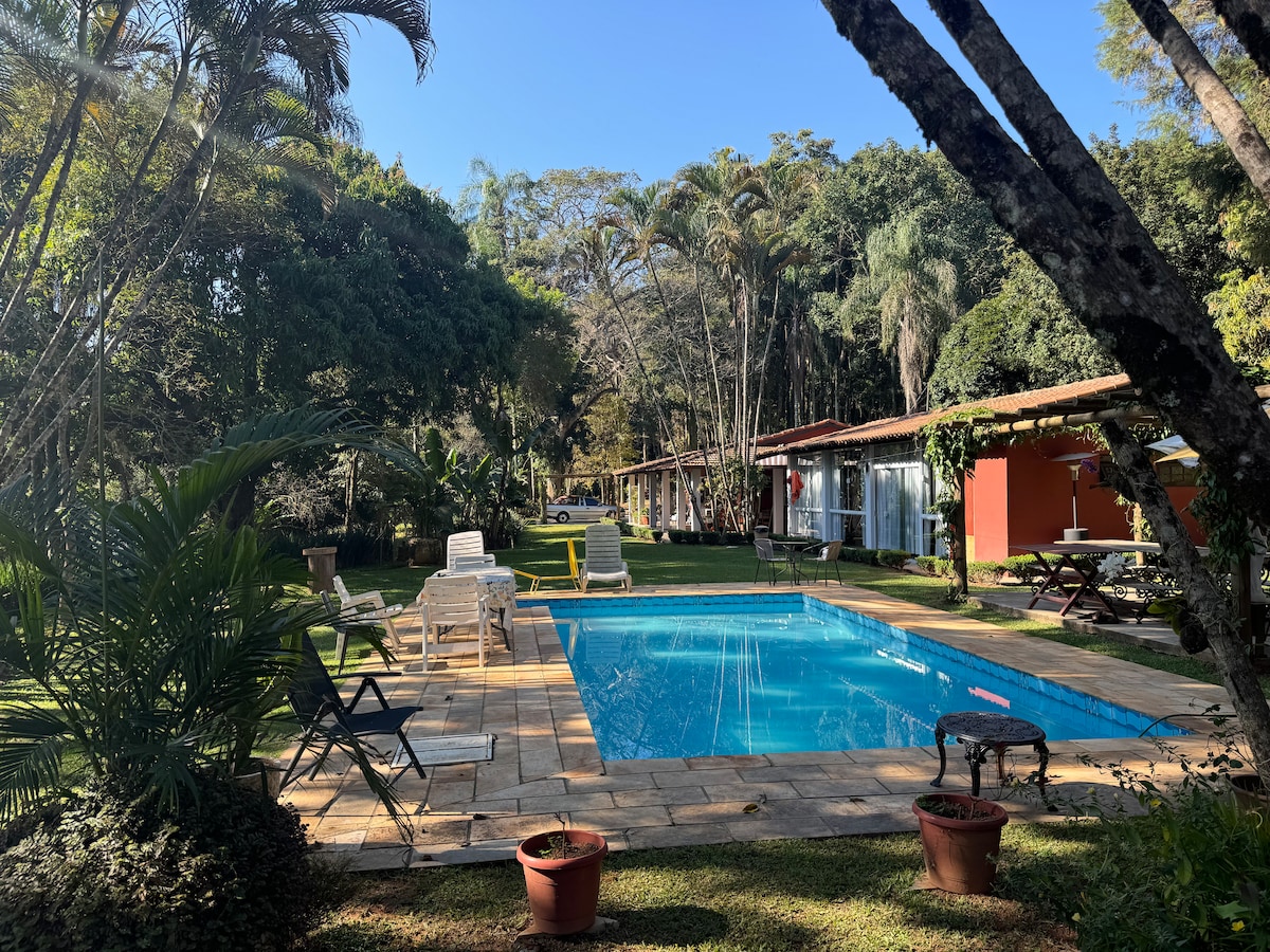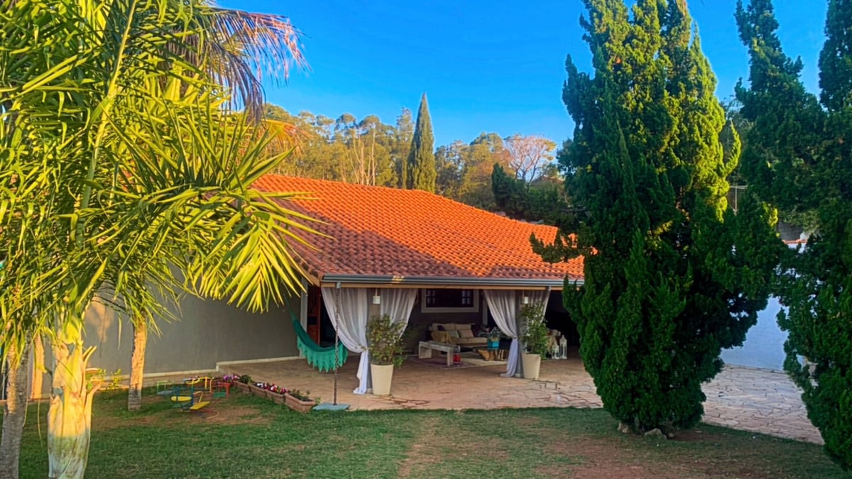 Nossa chácara é FAMILIAR, num terreno de 6 mil m². Grandes árvores, gramado, algumas frutíferas. Tudo limpo, organizado, tranquilo e seguro. A casa principal tem 5 dormitórios, 6 banheiros, é arejada e aconchegante. Cozinha é bem grande e equipada. A vista da varanda é muito bonita. A casa da edícula tem 1 quarto c/ 2 camas de solteiro, 1 banheiro completo, 1 pequeno escritório, área gourmet, espaço p/ vídeo game e lavanderia. Bairro residencial, muito arborizado e tranquilo.