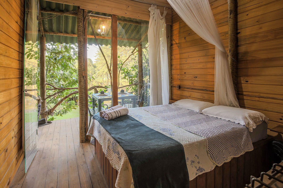 Venha desfrutar de descanso, natureza e paz na exclusiva casa dos Hobbits. - Cachoeira, Piscina, churrasqueira - Lago com peixes mansos (alimente nossas carpas!) - Caiaques e Prancha de Stand-up - Escorregador no Lago - Balanço - Árvores frutíferas - Fogo de chão. * Todos os atrativos são gratuitos e exclusivos para os hóspedes* * Aqui habitam insetos e pequenos bichos* * As cabanas possuem banheiro privativo e chuveiro quente*