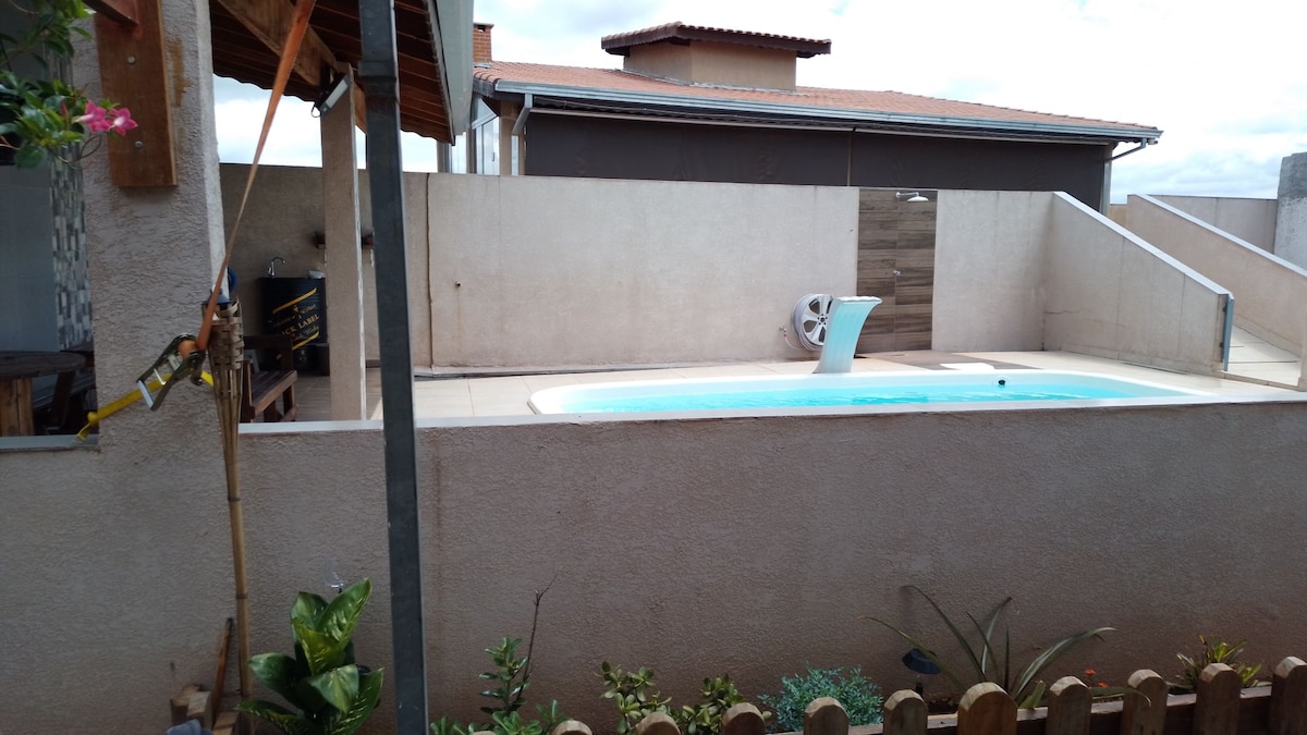 Casa térrea de 2 quartos, sala de estar, cozinha/edícula e lavanderia. Quintal amplo e arborizado,com piscina, mini-campo de futebol, quadra esportiva e garagem coberta. Piscina de alvenaria , com 8 metros de comprimento por 4 metros de largura, com profundidade variável e gradativa, começando em 80 cm até atingir 1,80 m. Há internet de fibra, com velocidade de 150mb, disponibilizada via conexão wi-fi.