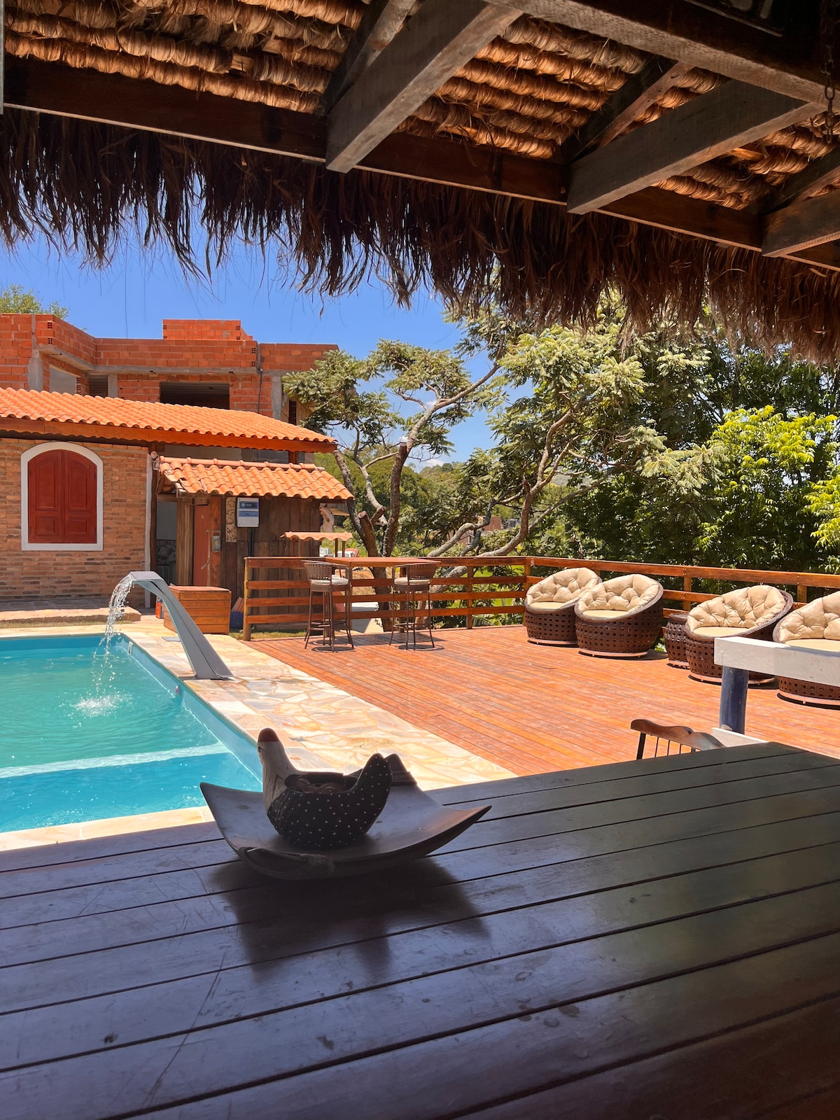 Relax at this unique and tranquil getaway. Our home is located in the countryside approximately an hour from São Paulo, between Itatiba and Bragança Paulista. Nestled among the hills in the middle of a farm. The gated condominium is the perfect get away from the busy city. You will be staying in the modern brick chalet, pool & large yard. Upstairs: full gourmet kitchen & dining area with two bathrooms & one small bedroom. Downstairs: 2 private suites & living room with sofa bed & smart TV.