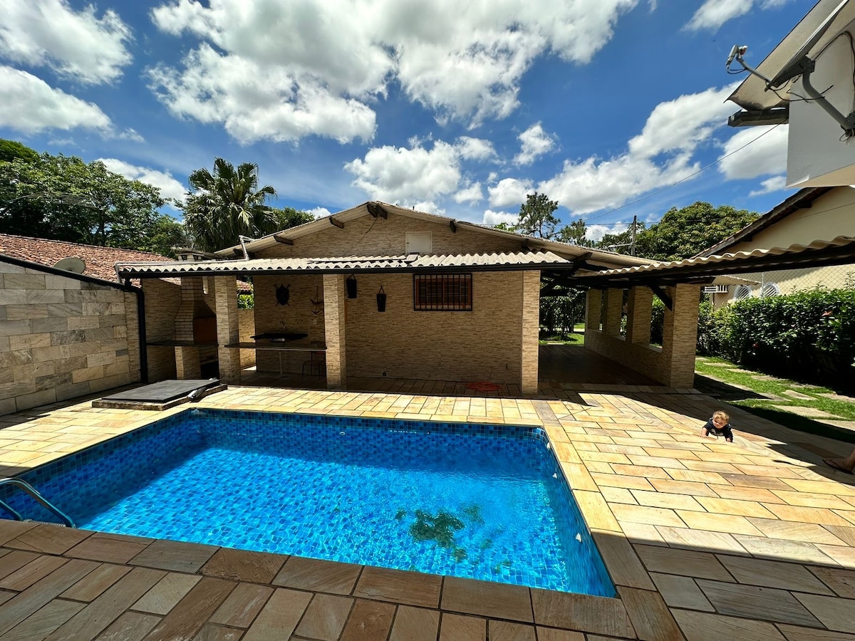 Venha passar momentos inesquecíveis! Muito espaço para descansar e se divertir! Tudo novo e moderno. Piscina com cascata, jacuzzi e prainha. Mesa de snooker, campo de futebol, pomar, horta e churrasqueira. São três suítes: duas no piso superior e uma no piso inferior. Cozinha e churrasqueira com todos utensílios! Obs. Ar condicionado, aquecimento da piscina e roupas de cama/banho mediante cobrança extra, consultar em outras informações.