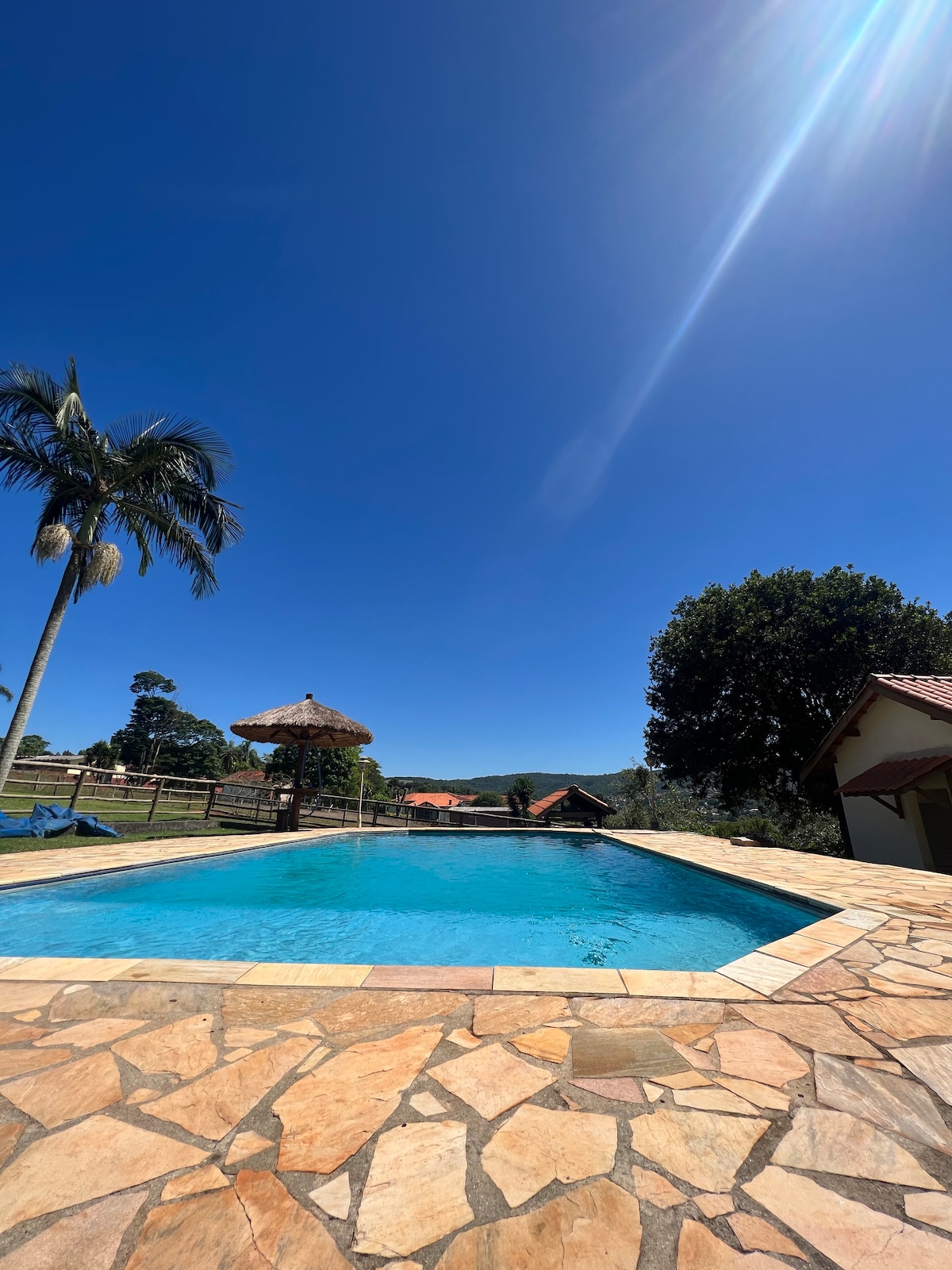 Relaxe neste espaço calmo e cheio de estilo. Terreno totalmente cercado, ideal para deixar seus pets livres. Há pássaros, esquilos, saguis, frutas, horta natural. Muita área livre e piscina estruturada de 7mil lts. Muitos espaços para conversar, redes e churrasco, fogueira . A casa é simples e cheia de charme informal. São dois quartos, uma suíte, a sala ampla, com 3 sofás, TV, internet fibra,Netflix e Amazon. Estamos na Rota das Frutas, ao lado do DODA TRAINING , escola de equitação.