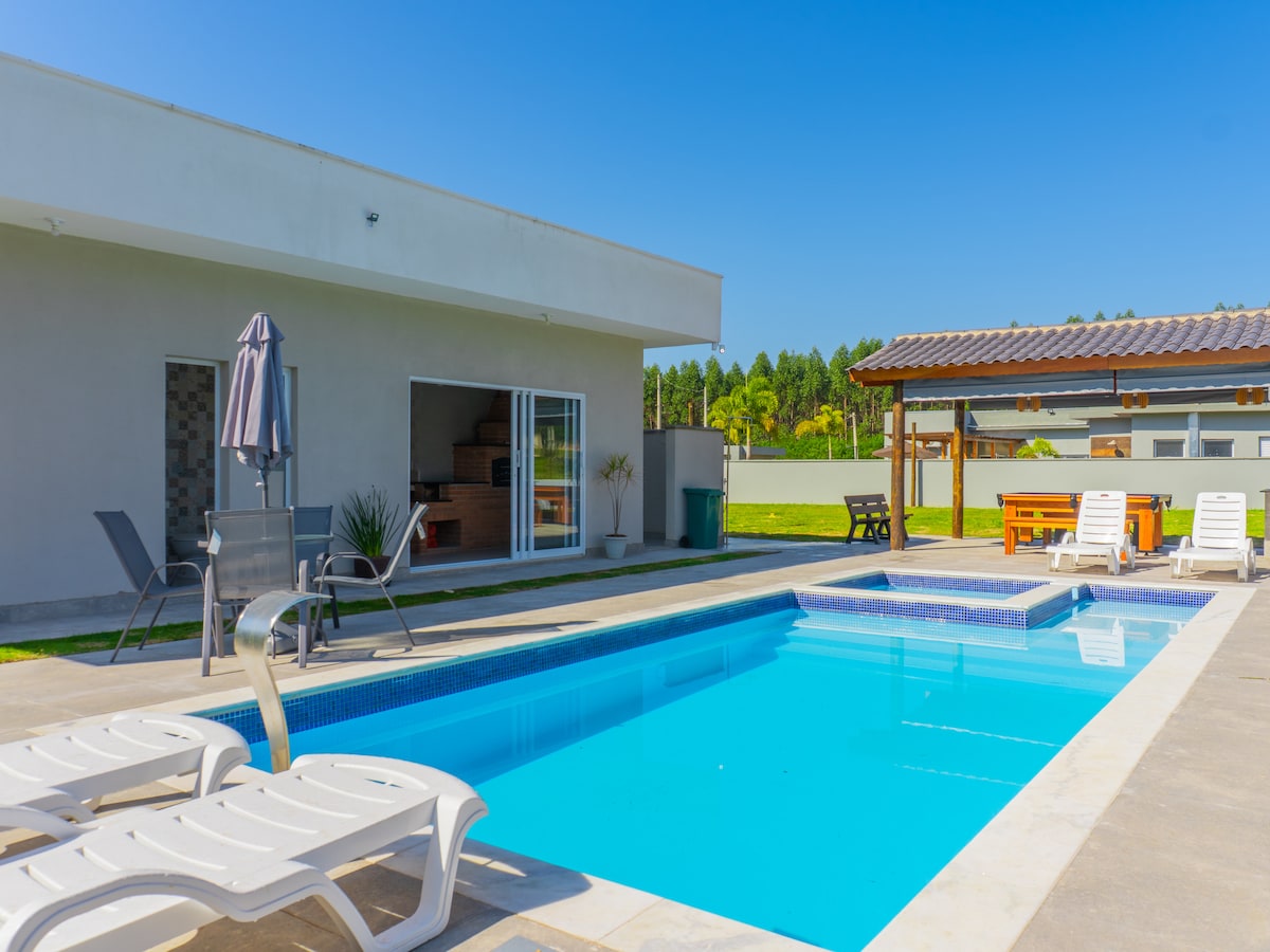 Linda casa com piscina aquecida e área gourmet. A nossa casa fica em um condomínio fechado, com fácil acesso pela Rodovia Castelo Branco. Condomínio lindo, com lago, clubes (acesso com day use), cercado por natureza, mercado e padaria, pista de caminhada/corrida/bicicleta, playground para as crianças, com portaria e segurança 24h. Seu Pet é bem vindo! :) Existem quantidade e regras. Favor nos consultar antes de fazer a reserva.