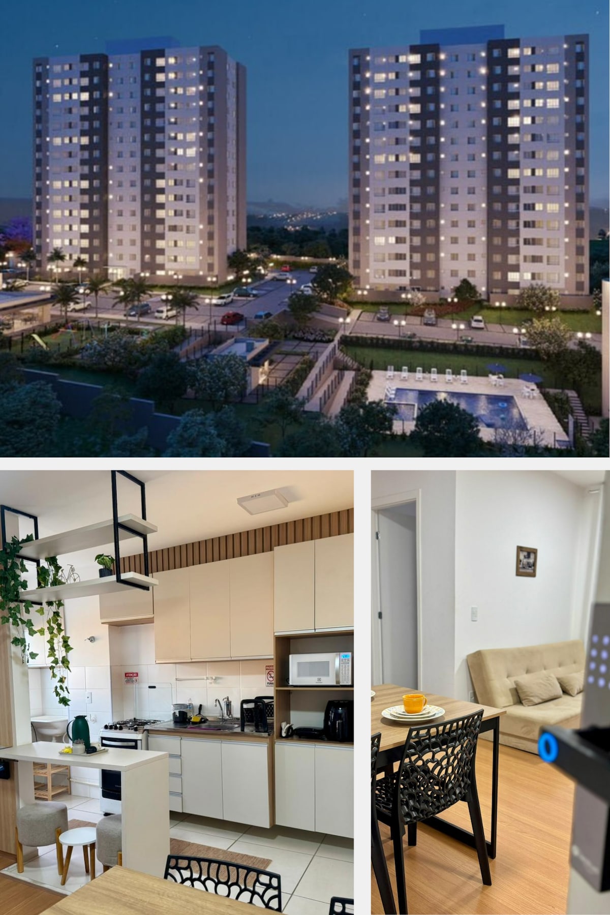Apartamento inteiro : Primeiro andar ( não possui escada para o apartamento) Comporta até 3 pessoas, com 1 vaga de garagem Smart TV 42 polegadas na sala Smart TV 32 no quarto Ventilador de teto no quarto Ventilador portátil Mesa de estudo . Oferecemos roupa de cama e banho . Porteiro 24 horas , perto de restaurantes , supermercado, farmácias, padaria, sorveteria e lotérica . Próximo à Arena do Galo ( 1,5 km) Fácil acesso ao Expominas ( 4,5 Km) Mineirão (13 km) Shopping Itau (4 km