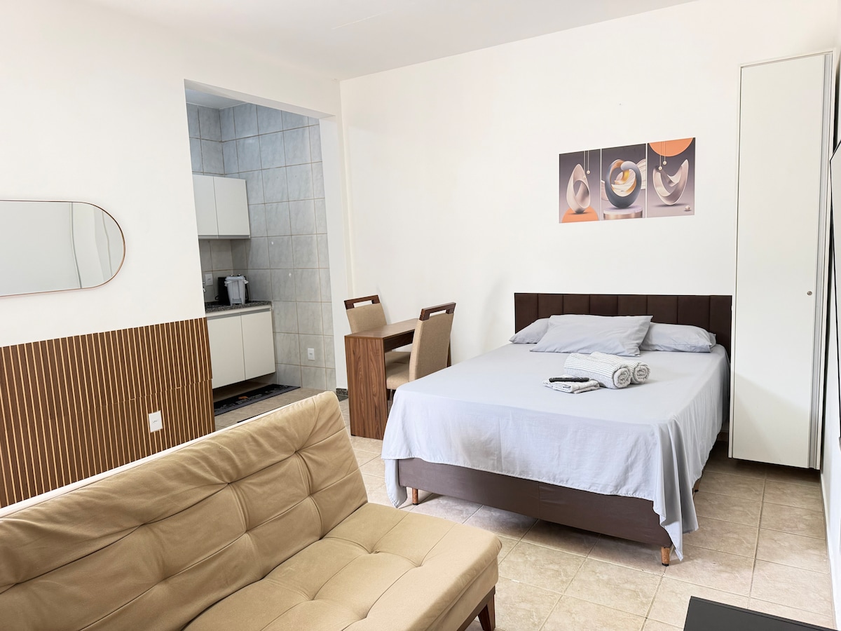 Studio privativo - NÃO é compartilhado, ideal para casais, viajantes solo ou família. Conta com: • Cama de casal e Sofá cama • Roupa de cama limpa & toalhas • TV Smart com acesso a aplicativos de streaming • 1 Vaga • Ar Condicionado A cozinha possui: • Frigobar, armários + utensílios básicos, microondas, cafeteira, airfryer & bebedouro. Além disso, contém banheiro privativo com chuveiro. Ambiente tranquilo, funcional e com excelente custo-benefício para estadias curtas ou longas.