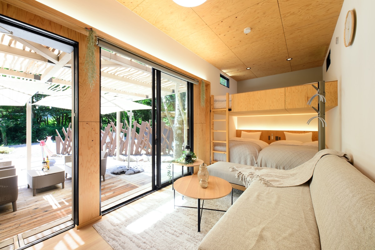 伊豆高原でグランピング!ウッドデッキでBBQ。ペット無料のハンモックすべり台のある家族向けコテージ