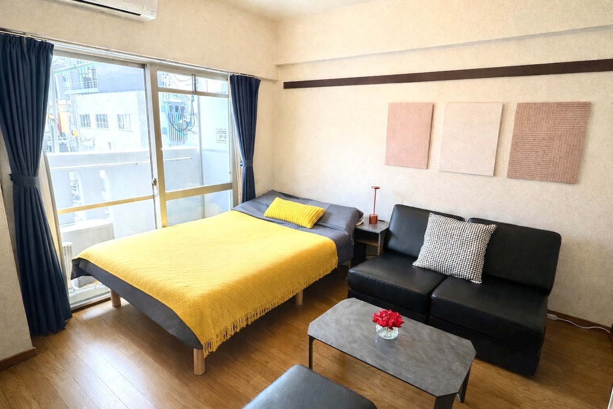 距离福冈「地铁天神站」步行5分钟。改建的公寓房间。1张双人床和1张沙发床。