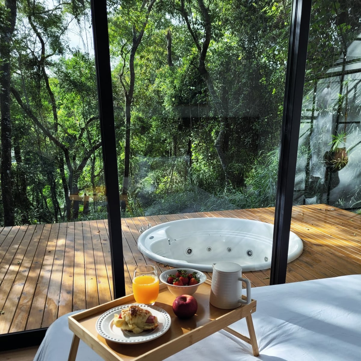 🤩NOVO! 🌿Viva o luxo do simples !!! A Cabana Encantada é um refúgio romântico entre pinheiros🌲, com lareira🔥e banheira🛁 para momentos de puro relaxamento. Pensada para casais, combina privacidade, conforto e uma atmosfera acolhedora. A iluminação quente, o design em madeira e a vista para a natureza criam o cenário ideal para desacelerar. Com cozinha equipada e ambiente silencioso, é perfeita para viver dias especiais e memoráveis.🌿