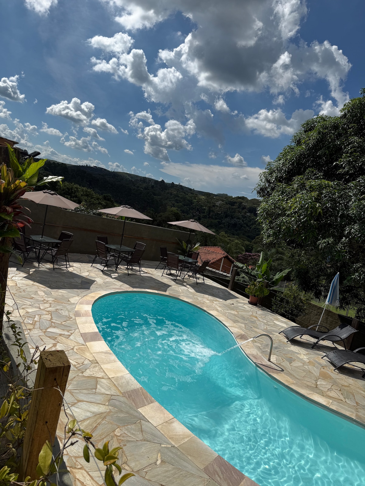 Casa avarandada com vista fantástica. 02 suítes, 3 dorm, 4 banheiros, sala com 3 ambientes, cozinha americ. área gourmet com churrasqueira, forno p/ pizza e fogão a lenha, salão de jogos com Mesa de sinuca e de tênis. Piscina com área rasa para crianças. A casa acomoda até 20 pessoas. O valor da diária é para até 14 incluindo crianças. Tx limp 210 Obs: Temos todos os utensílios na casa, porém não fornecemos roupa de cama, travesseiro e banho devido os mesmo serem constantemente extraviados.