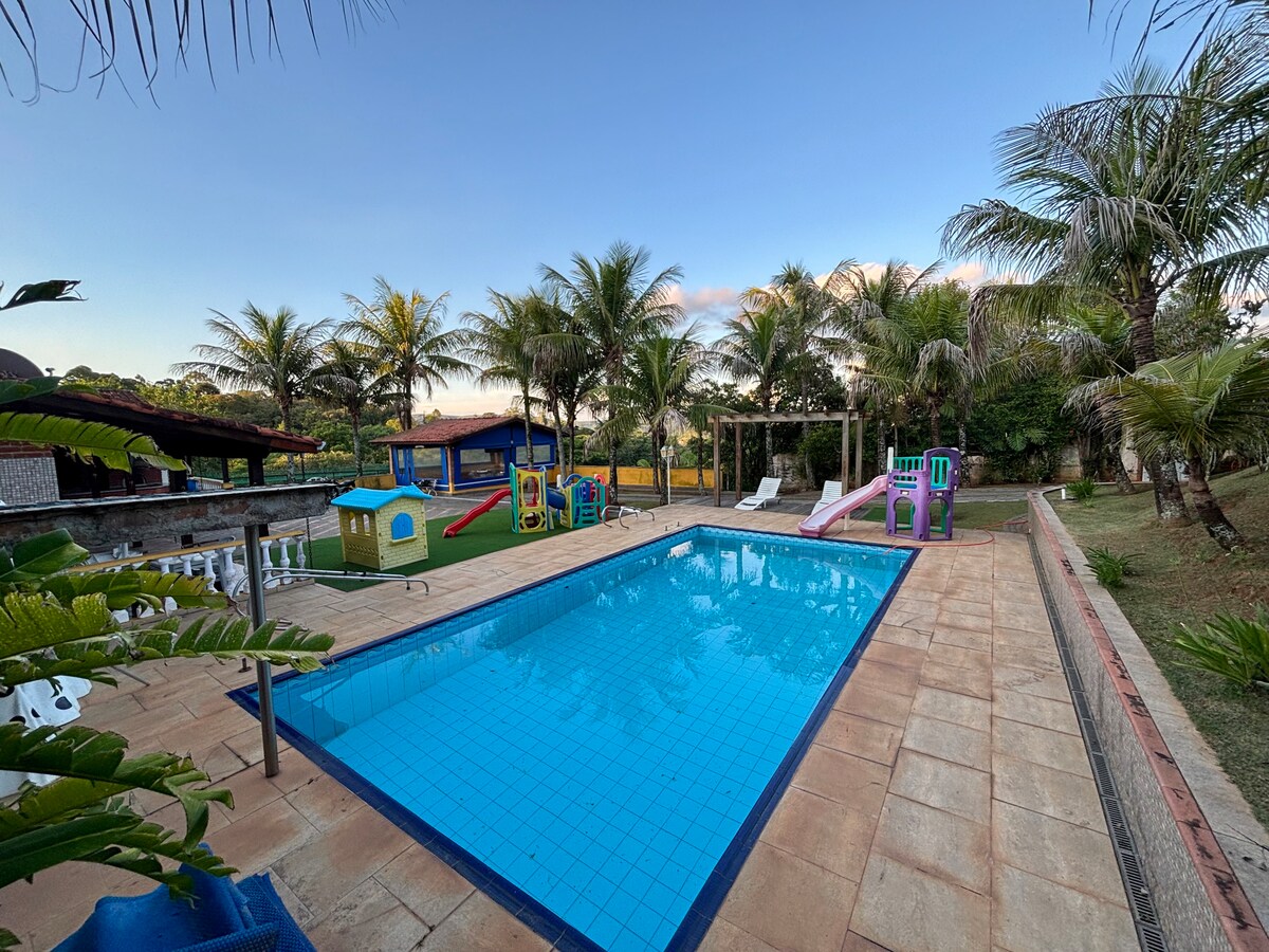 Chacara Cond Fechado, Segurança 24Hs tudo novo, com uma aconchegante casa toda Varandada que possui Por do Sol de cinema, possui 3 quartos com Suites completas. Cozinha equipada, Internet, guarda sol grandes, cadeiras de piscina, estacionamento e muito mais.A churrasqueira possui fogão a lenha, com dois banheiros externos além da piscina 8x4 com cascata decorativa, sol pega o dia todo na piscina. Todas tomadas tem 220V e 110V.