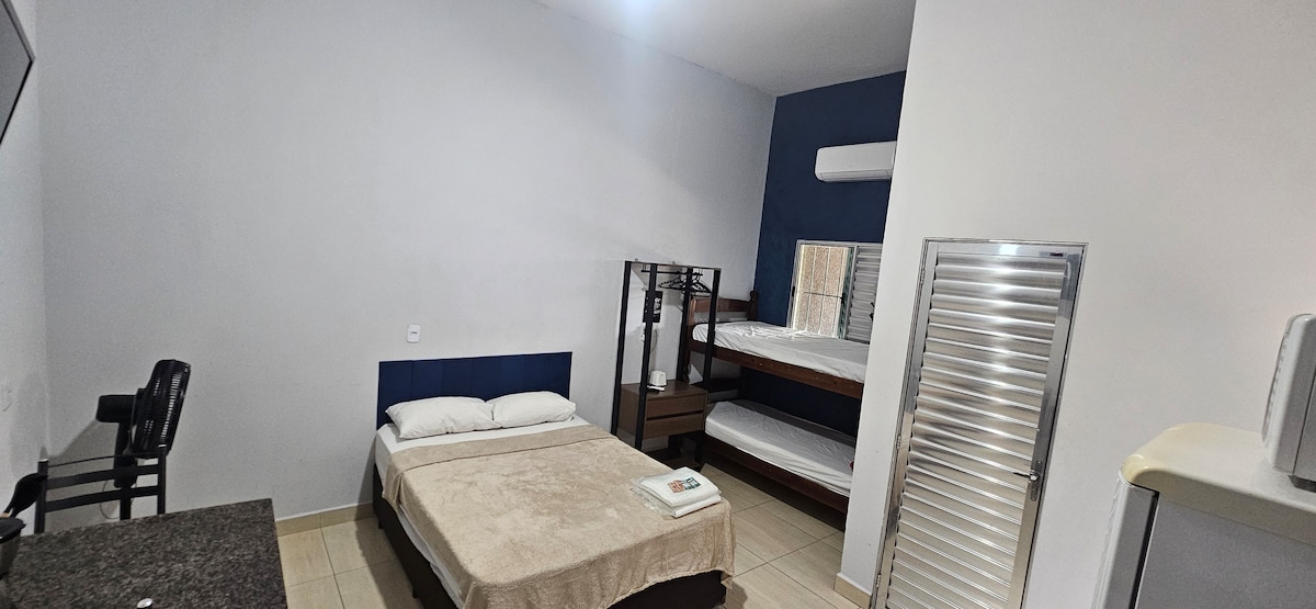 Seja bem-vindo ao Loft 1! 🏡 Uma acomodação térrea, espaçosa e aconchegante, ideal para quem busca conforto e praticidade em Salto. O espaço acomoda até 4 pessoas, com uma cama de casal 1 beliche 🛌 (2 camas de solteiro), garantindo noites tranquilas. Fornecemos roupas de cama, manta e travesseiros 🛋️, para sua comodidade. Conta ainda com mesa e 2 cadeiras 🍽️, ideal para refeições rápidas e práticas.