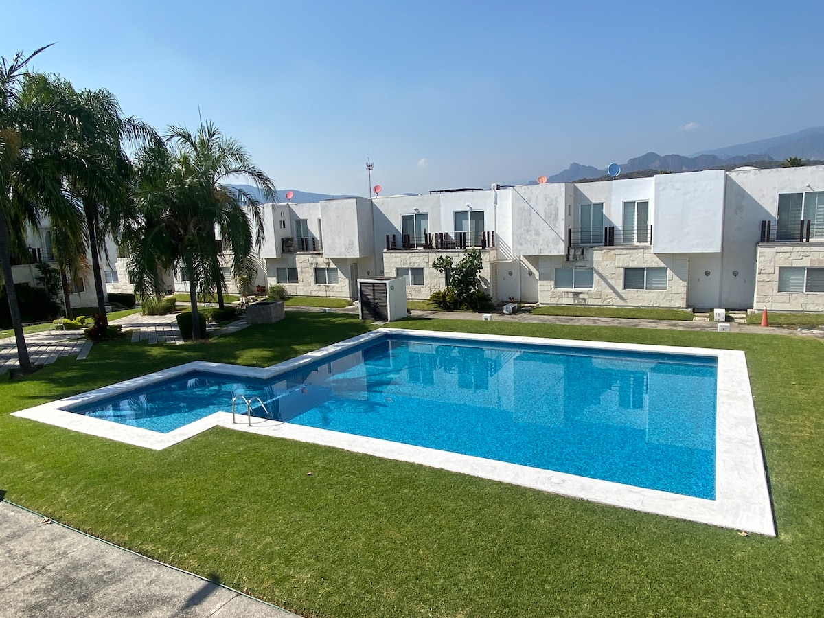 Feel like being home! This nice property on Morelos Mexican State,is near by a lot of Magic Towns and it has and espectacular Mountains view .It has 3 rooms, 2 with full beds and 1 with Queen and 2 restrooms. In the main room you have Air conditioner at anytime and a terrace. Enjoy the nice weather all the year and have fun at the pool! You’ll have all necessary to rest and feel the great energy we have al the place.