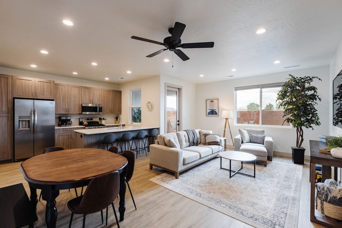 Brand New townhome is located 36 miles to Zion's National Park, and features a private outdoor hot tub, fire pit, and a heated pool! The quiet Vida Sol community is located only 2 minutes off of I-15 and 5 minutes to the St George outlet stores and Walmart/Costco. Mountain biking, walking trails and two parks nearby. ✓Private hot tub 🏊Heated Pool (Shared, heated year-round) 🛏️3BR/3BA 🛋️2 Living Rooms 👨🍳 Chef's kitchen 📶Fast/Free internet 📺Smart TV's ❄️AC 🔥Fire pit 🍖Grill 🛀Big bathtub