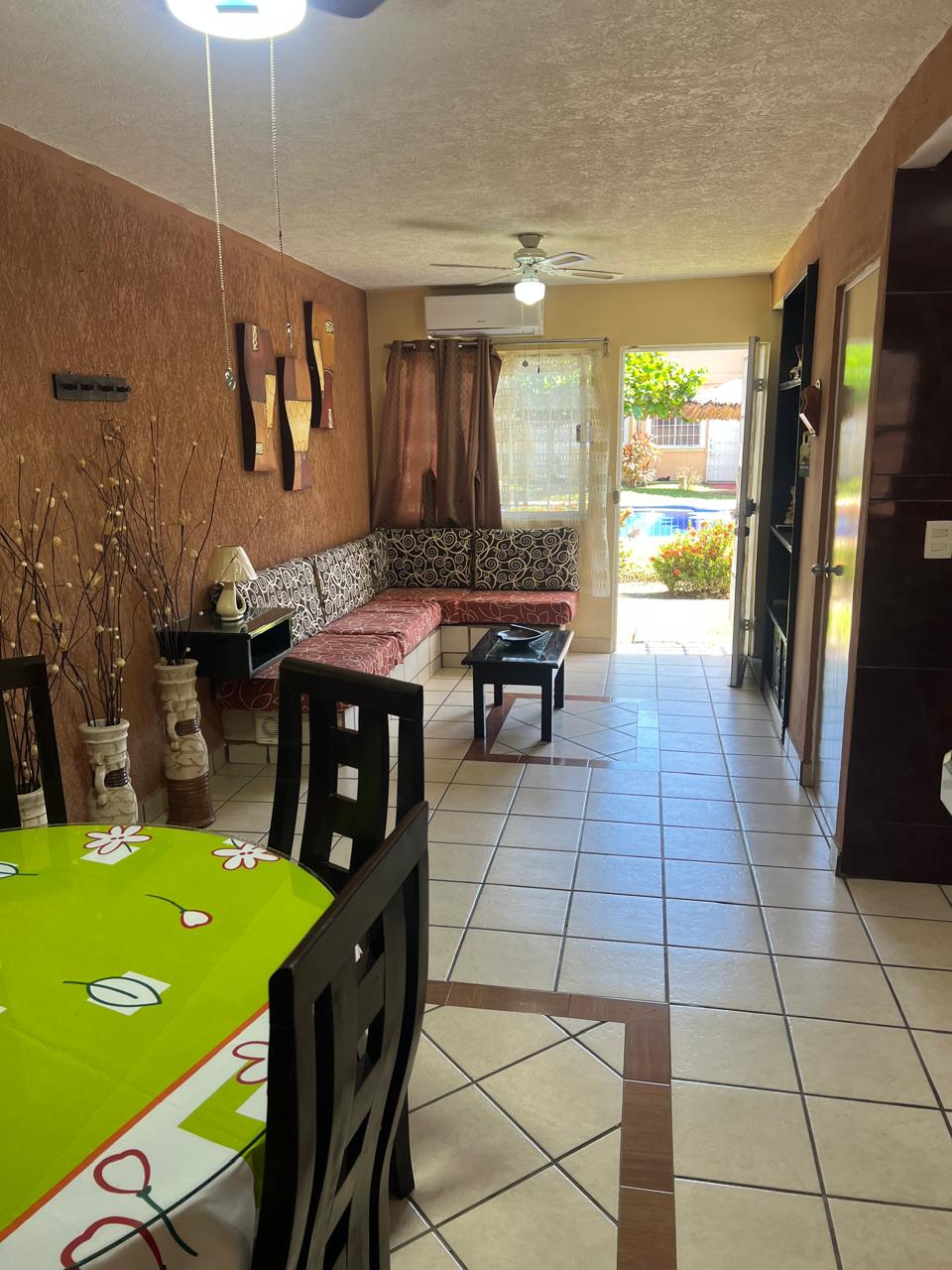Disfruta de una estancia relajada en nuestra casa cerca de la playa con alberca entre árboles y palmeras, ideal para pasar días tranquilos en familia. Cuenta con 4 recámaras con aire acondicionado; 2 con baño privado y 2 que comparten baño exterior. Medio baño adicional. Sala y comedor amplios, cocina equipada (sin aire en áreas comunes). Disfruta la vista al jardín y alberca, con estacionamiento para 3 autos, en un ambiente cálido y cómodo.