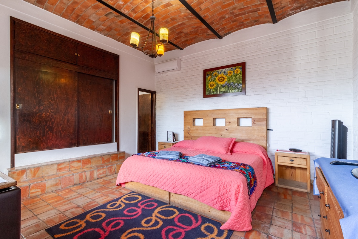 Guanajuato is a charming studio in the heart of Ajijic. Note that due to low ceilings the suite is not suitable for tall people and that the bed is double-sized and may feel a bit small for two adults sharing. Only two blocks from the main square at the San Andres church, and two blocks from the lake Chapala boardwalk it is a brief walk to numerous restaurants, galleries, various kinds of shopping and more. As a guesthouse we have housekeeper with onsite presence Monday through Saturday.