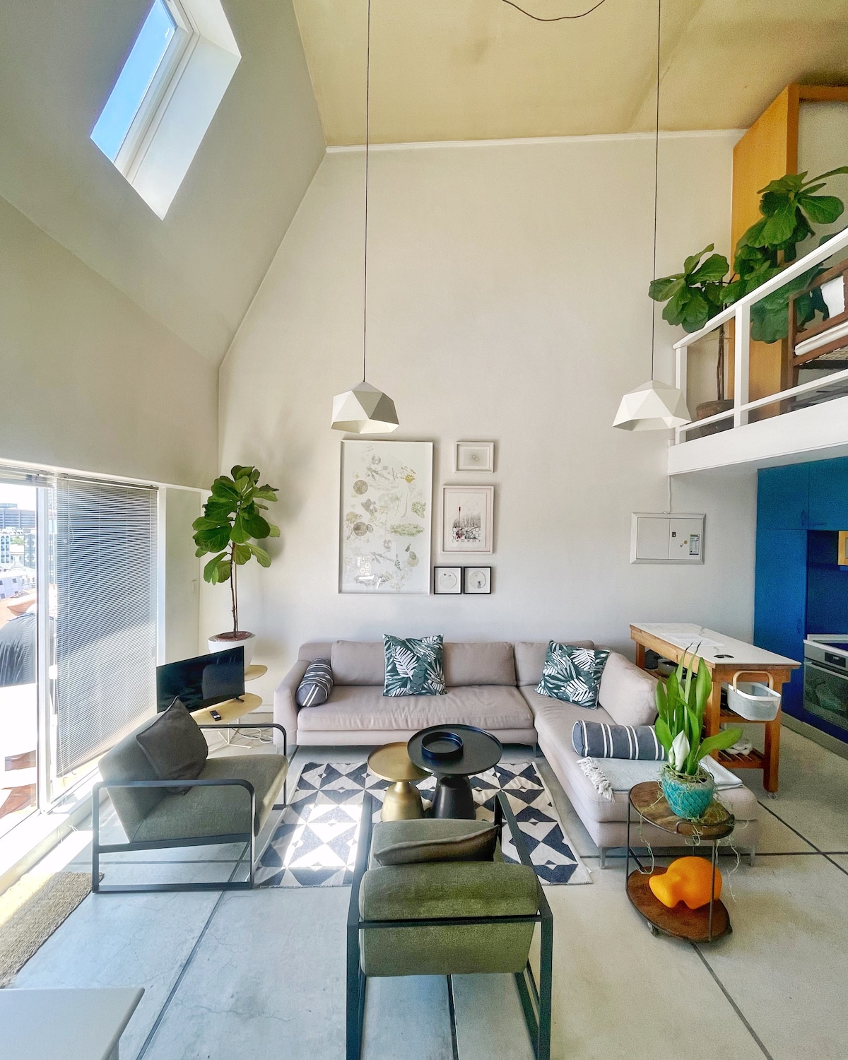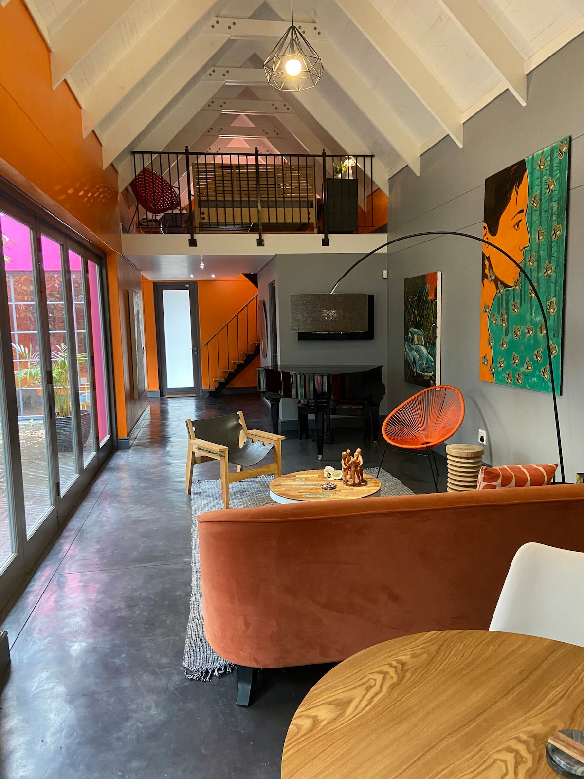The vast open-plan apartment features soaring ceilings, a blend of industrial finishes and boutique design, and pops of color throughout, as well as a spiral staircase to a raised bedroom with a bathroom. The main area has separate bedroom with a huge bathroom. Extremely spacious and bright. Floor to ceilings are 4,5 meters. It’s well equipped with custom made furniture, art books, and fast internet/Netflix premium. It's located in of East City, the (newest) trendy area in central Cape Town.