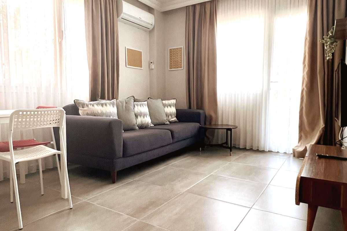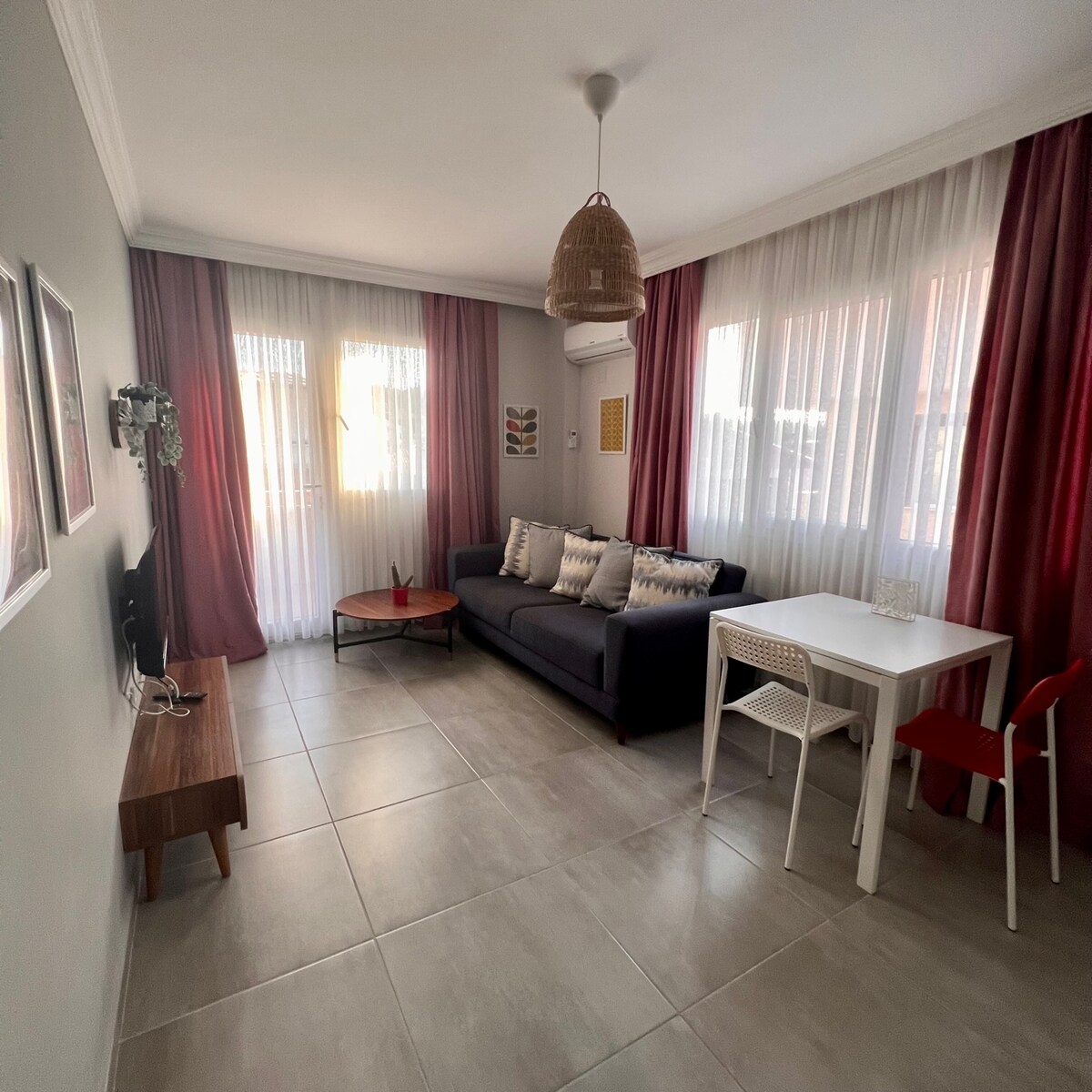 Located in the peaceful surroundings of Karaburun, this quiet 2-bedroom ground floor apartment offers a comfortable stay for guests who value privacy. It has a private garden entrance with no stairs, ideal for families with children. The apartment includes two bedrooms, a living area, and a fully equipped kitchen, plus washing machine, TV, and free Wi-Fi. Town center is within walking distance. A car is recommended to explore the area. Ideal for families or couples seeking a peaceful stay.
