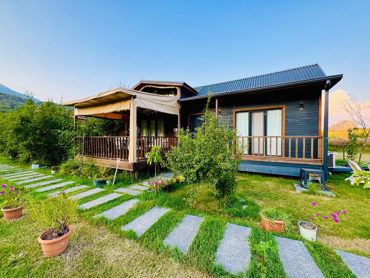Unique bungalow in an calm soothing ORGANIC orange and lemon garden. Relax your body in an open-air heated jacuzzi. In the afternoon, walks in the fresh air by the sea in Akyaka 10 min by car from the house, a walk in the pine forest just behind, horseback riding in the stable. In the evening you can watch your favorite Netflix series. Grossery and alcohol shop 10 min by walk.