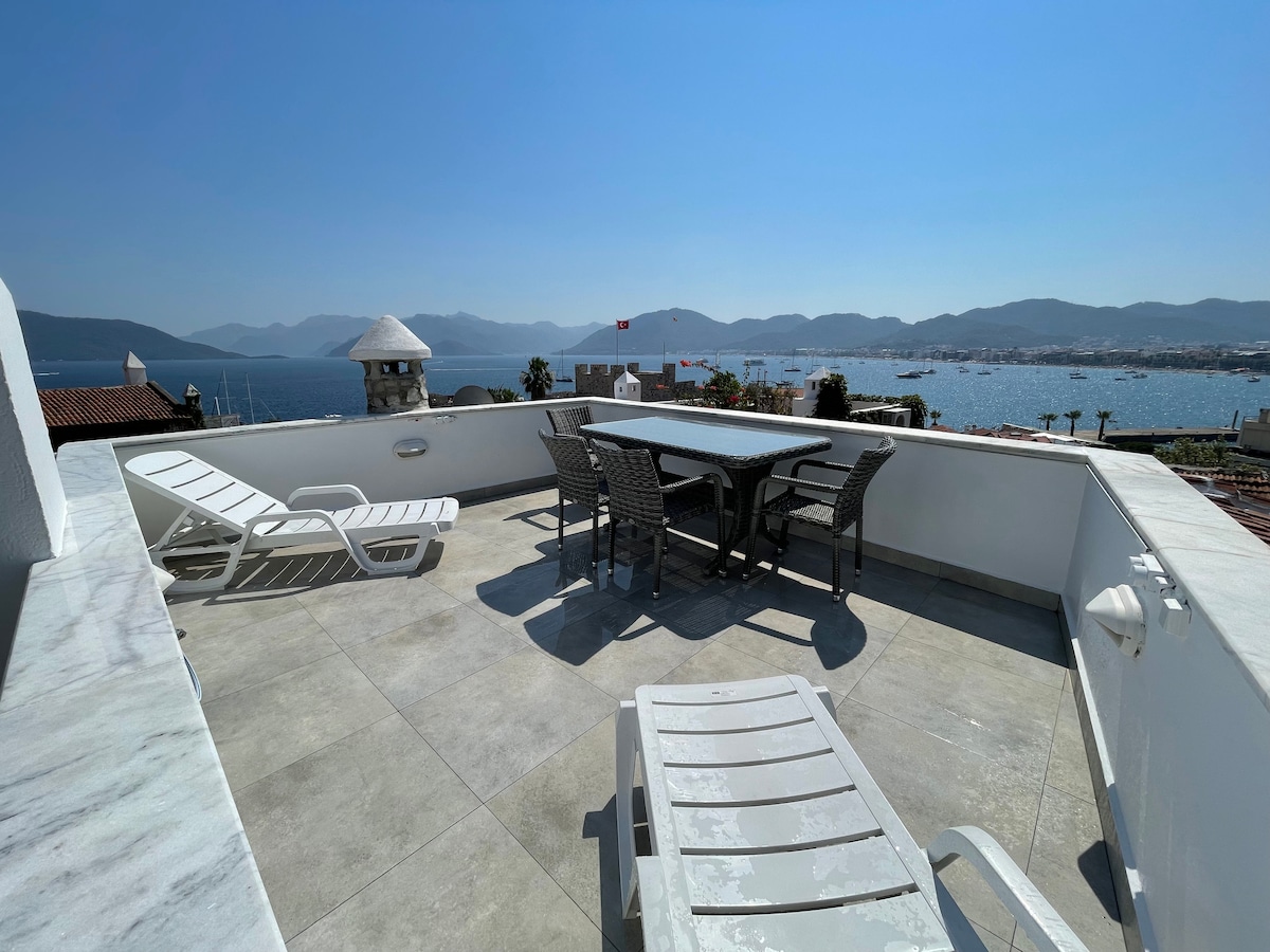 Fethiye'nin merkezinde, panaromik şehir manzaralı dairemizde keyifli bir tatil deneyimi sizleri bekliyor. Jakuzimizde içkinizi yudumlarken eşsiz Fethiye körfez manzarasının keyfine çıkarabilirsiniz. 4 yatak odası bulunan dairemizde yaklaşık 70 metrekare balkon alanı bulunmaktadır. Her iki katta yer alan banyo ve tuvalet sayesinde 2 aile birbirinden bağımsız çok rahat bir tatil geçirebilir. Özel otoparkı Ölüdeniz yolu üzerindeki konumuyla tatilinizi çileden keyfe dönüştürmeyi hedefledik.