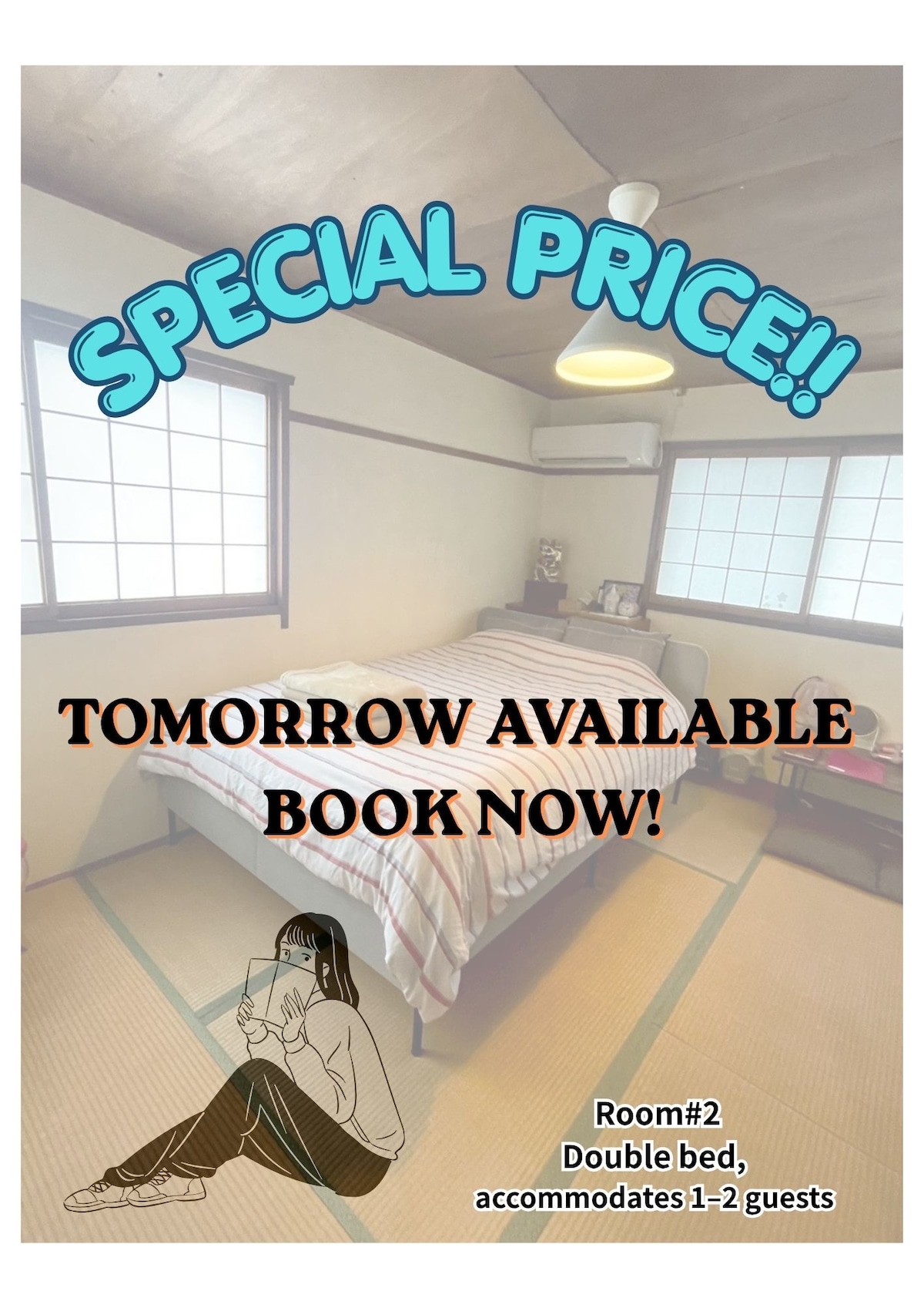 距离Izumisano站步行1分钟(距离机场15分钟),1人4500日元,2人9000日元,西式床,最多可供2人入住
