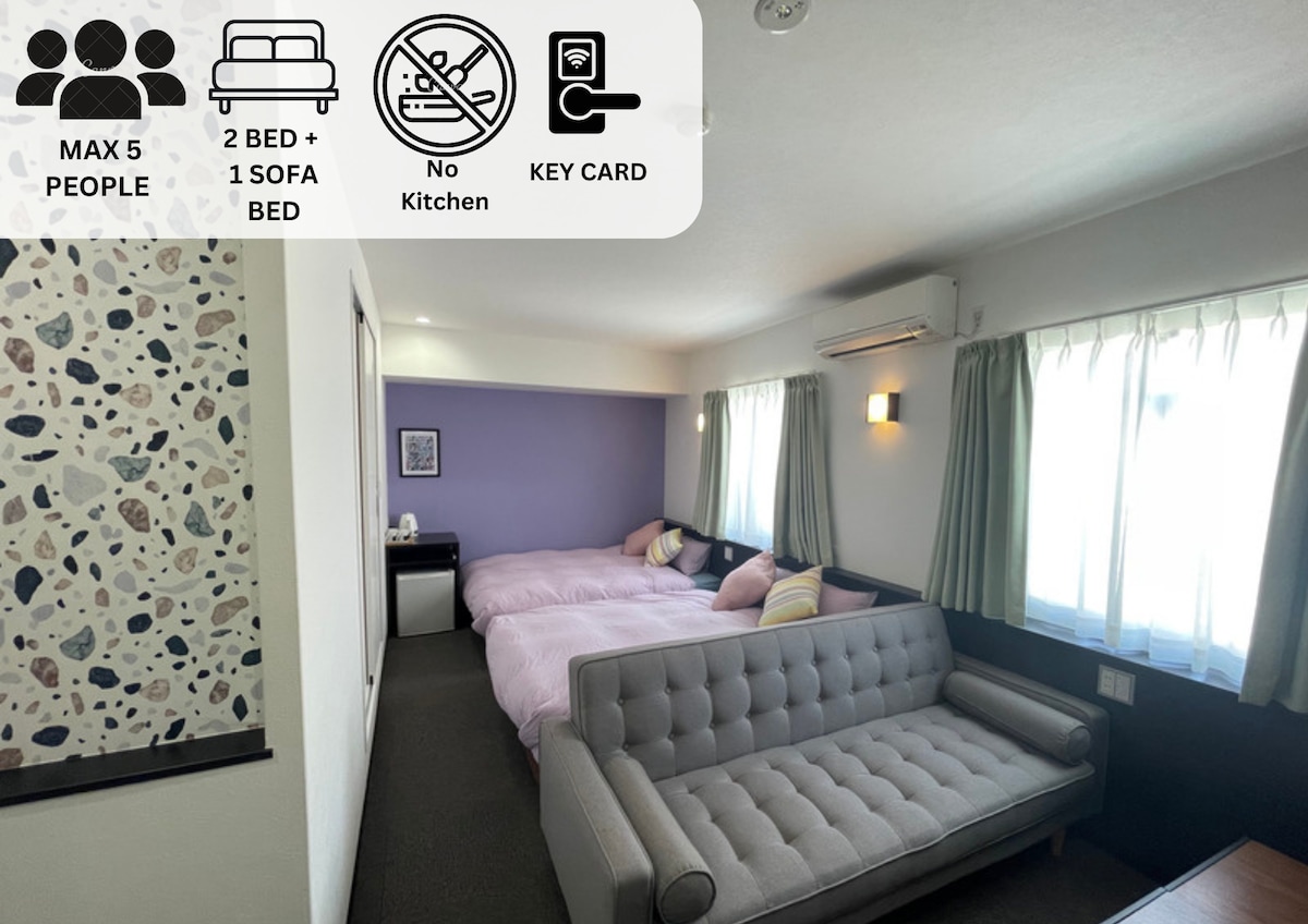 民泊専用のセミセルフホテル シンプルに必要なものだけを備えています。 滞在中の清掃やリネン・タオル交換は行っていませんが、リーズナブルな価格です。 3名以上宿泊可能の部屋。30㎡ 家族・友人で1部屋に泊まることができます ダブルベット2台とソファ(ソファベッド)があります。クローゼットもありますのでスーツケース収納可能です。 この部屋にあるトイレと風呂はseparate toilet・separate bathroomです。 入口はオートロックです。鍵カードを使用します。 チェックインは午後15時開始。午後23時まで。 チェックアウトは午前10時まで。 南海新今宮駅・JR新今宮駅からリスティングまで徒歩で1分です。駅のすぐ隣にあります。 地下鉄動物園前駅からリスティングまで徒歩で5分です。 関西空港から直通40分。乗り換え無し。 新世界エリア、天王寺エリアまで徒歩で約10分です。 なんば(道頓堀)や心斎橋まで電車で約15分です。 USJまで電車で約25分です。(乗り換え1回) 近くにスーパーやコンビニエンスストア・ドラッグストアがあります。