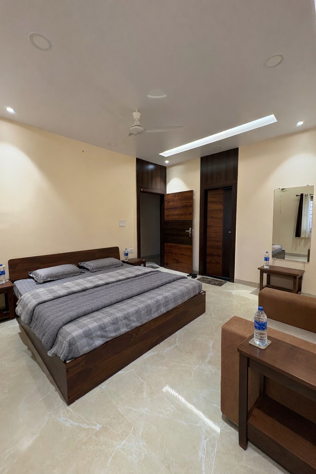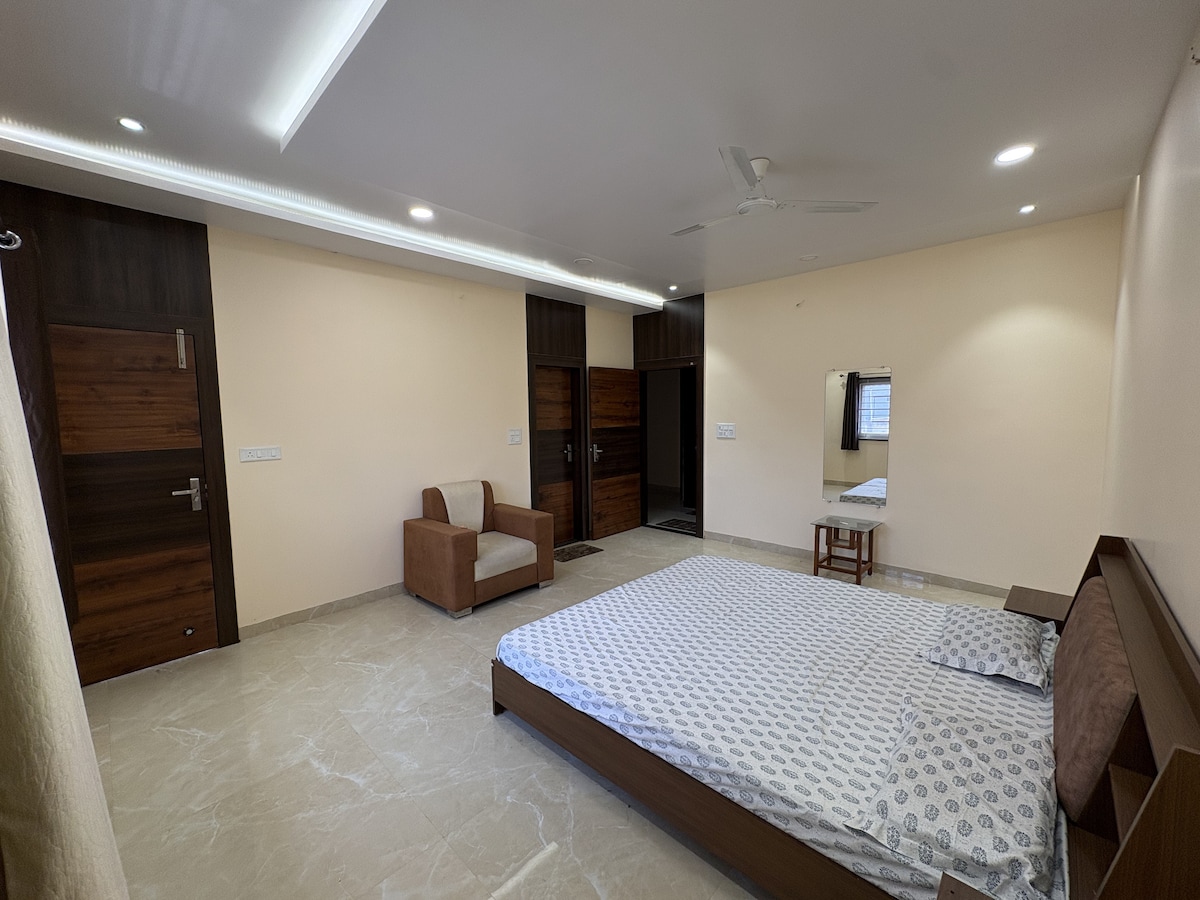Welcome to our urban retreat in the heart of Jabalpur! Built on 2400 sqft of plot area, ensuite bathroom and a balcony, it's perfect for families or tourists seeking relaxation. Enjoy the sprawling living and dining area with every corner fully airconditioned. Step onto the running sky deck, offering panoramic views of greenery and the bustling main road. Located on the first floor, your hosts reside on the ground floor, ensuring prompt assistance and a delightful stay.