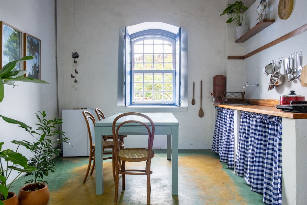 Uma casa cheia de artes localizada no coração do Centro Histórico de Paraty-RJ, idealizada por um casal apaixonado por cultura brasileira e nossas artes. A residência, perfeita para um casal, fica no primeiro andar de um sobrado histórico, na principal rua e quarteirão da cidade. O casarão foi recém reformado pelo próprio casal, tendo como premissa o respeito por sua história, as imperfeições de uma construção ancestral feita à mão, associada a um morar contemporâneo e com conforto.