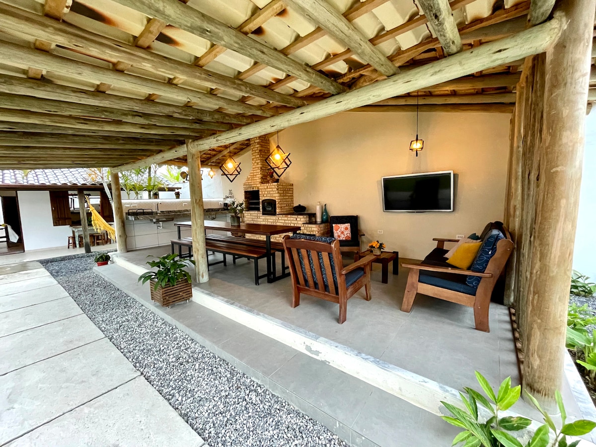 🏖️Esta acomodação elegante, é perfeita para viagens em família, encontro com amigos. A Casa é moderna, nova, espaçosa, fica em Paraty, duas quadras da praia do Jabaquara (150m), 5 minutos de carro do Centro Histórico da cidade e Cais, onde saem barcos de passeio. Possui 3 amplas suítes, com ar condicionado, ventilador de teto e banheiro privativo, uma no térreo e duas no andar superior. Área gourmet com churrasqueira, rede, piscina e um lindo jardim. Possui Wi-Fi, garagem para 3 carros.