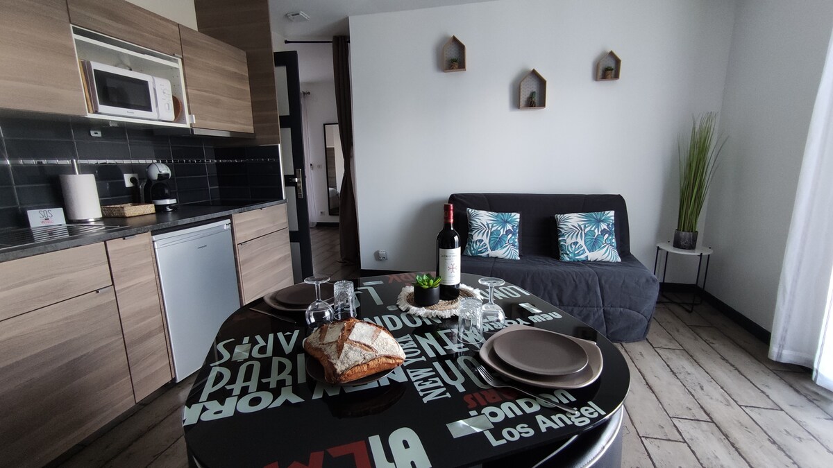 Dans une maison d'architecte situé en rez-de-chaussée avec entrée indépendante. Agréable et Lumineux logement de type F1 tout confort de 28 m2. Il est composé d'un espace nuit séparé par un rideau comprenant un lit 2 places avec dressing et un coffre fort. Un coin salon avec canapé lit 2 places. Coin cuisine équipée. Une salle d'eau avec douche, machine à lavé, lavabo et un WC. Le tout donnant sur un petit jardin et terrasse privée .