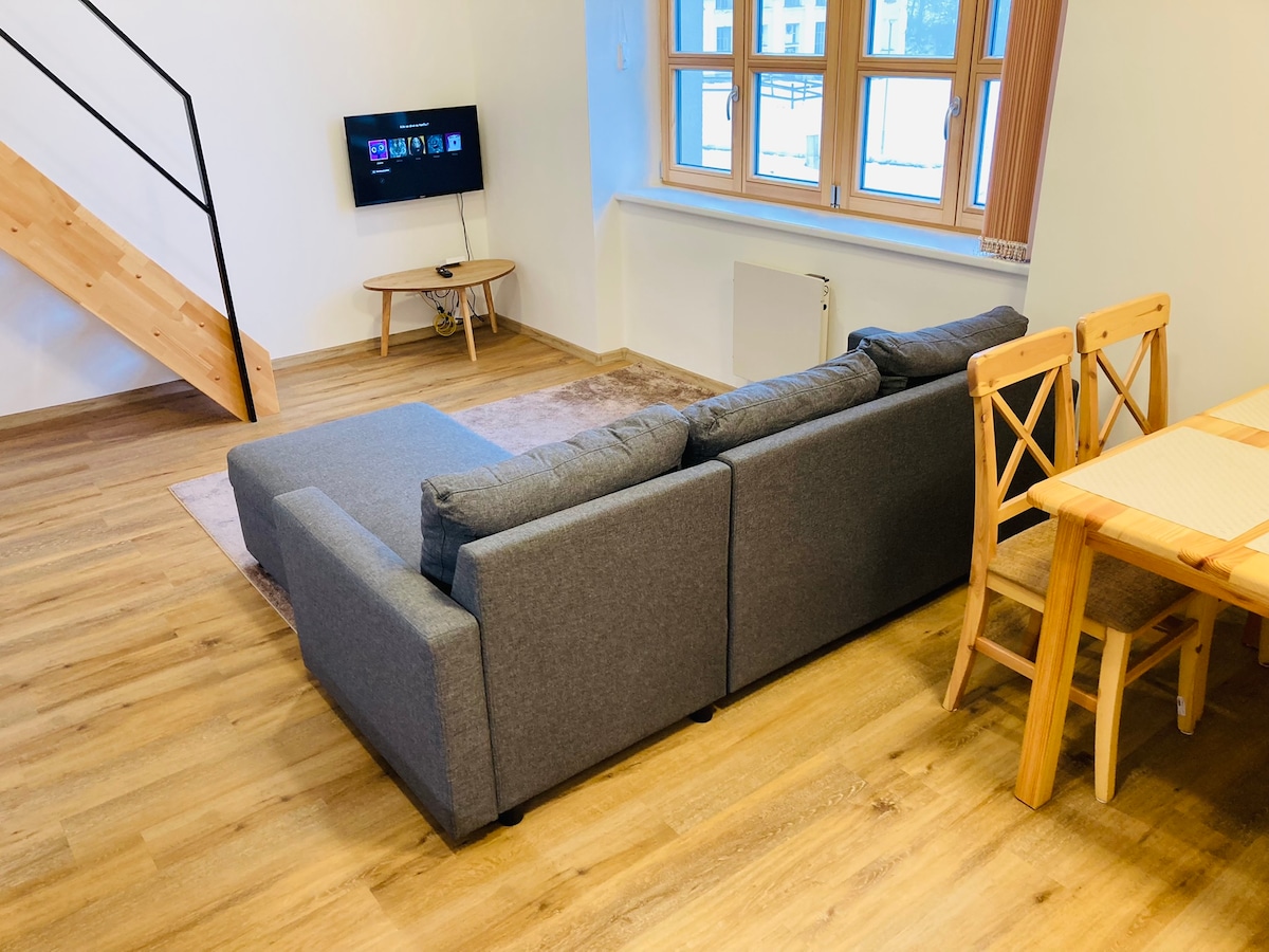 Skog is modern apartment designed in a minimalist Scandi style, using mostly natural materials in the interior. It has about 70m2 and includes 2 separate bedrooms. One is in the attic with lower ceiling. A spacious terrace belongs to the apartment. It is situated in the neighbourhood with some other built houses in similar style within walking distance to the centre. Mumlava waterfall is only 10mins forrest walk. 007 building (gym and squash centre) is being renovated from 07/2025 to 11/2025.